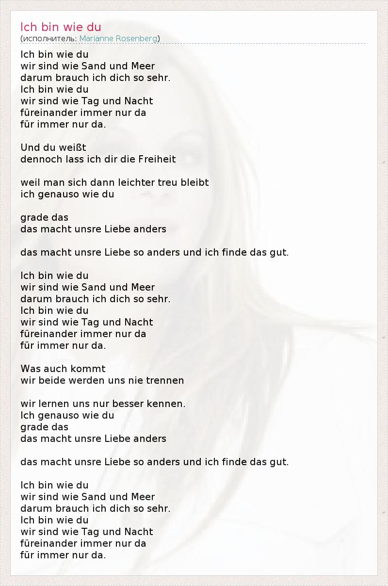 Ich bin wie du wir sind wie Sand und Meer darum brauch ich dich so sehr. Ich bin wie du wir sind wie Tag und Nacht füreinander immer nur da für immer nur da. Und du weißt dennoch lass ich dir die Freiheit weil man sich dann leichter treu bleibt ich genauso wie du grade das das macht unsre Liebe anders das macht unsre Liebe so anders und ich finde das gut. Ich bin wie du wir sind wie Sand und Meer darum brauch ich dich so sehr. Ich bin wie du wir sind wie Tag und Nacht füreinander immer nur da für immer nur da. Was auch kommt wir beide werden uns nie trennen wir lernen uns nur besser kennen. Ich genauso wie du grade das das macht unsre Liebe anders das macht unsre Liebe so anders und ich finde das gut. Ich bin wie du wir sind wie Sand und Meer darum brauch ich dich so sehr. Ich bin wie du wir sind wie Tag und Nacht füreinander immer nur da für immer nur da.