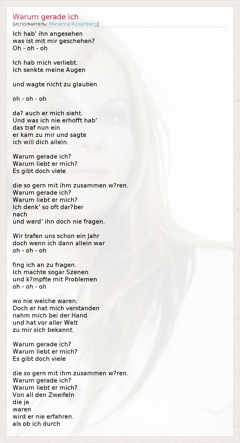 Ich hab' ihn angesehen was ist mit mir geschehen? Oh - oh - oh Ich hab mich verliebt. Ich senkte meine Augen und wagte nicht zu glauben oh - oh - oh da? auch er mich sieht. Und was ich nie erhofft hab' das traf nun ein er kam zu mir und sagte ich will dich allein. Warum gerade ich? Warum liebt er mich? Es gibt doch viele die so gern mit ihm zusammen w?ren. Warum gerade ich? Warum liebt er mich? Ich denk' so oft dar?ber nach und werd' ihn doch nie fragen. Wir trafen uns schon ein Jahr doch wenn ich dann allein war oh - oh - oh fing ich an zu fragen. Ich machte sogar Szenen und k?mpfte mit Problemen oh - oh - oh wo nie welche waren. Doch er hat mich verstanden nahm mich bei der Hand und hat vor aller Welt zu mir sich bekannt. Warum gerade ich? Warum liebt er mich? Es gibt doch viele die so gern mit ihm zusammen w?ren. Warum gerade ich? Warum liebt er mich? Von all den Zweifeln die je waren wird er nie erfahren. als ob ich durch