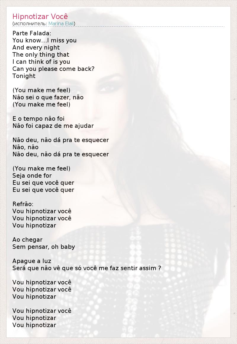 Parte Falada: You know…I miss you And every night The only thing that I can think of is you Can you please come back? Tonight (You make me feel) Não sei o que fazer, não (You make me feel) E o tempo não foi Não foi capaz de me ajudar Não deu, não dá pra te esquecer Não, não Não deu, não dá pra te esquecer (You make me feel) Seja onde for Eu sei que você quer Eu sei que você quer Refrão: Vou hipnotizar você Vou hipnotizar você Vou hipnotizar Ao chegar Sem pensar, oh baby Apague a luz Será que não vê que só você me faz sentir assim ? Vou hipnotizar você Vou hipnotizar você Vou hipnotizar Vou hipnotizar você Vou hipnotizar Vou hipnotizar