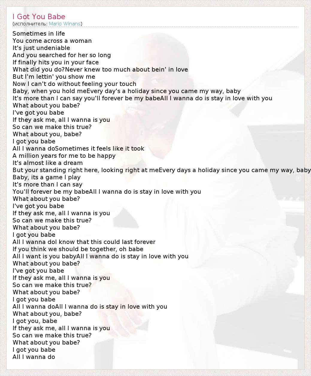 Это интересно:Певец, музыкант, композитор Mario Winans — единственный не gospel артист из знаменитой семьи Winans. Свой дебютный альбом «Story of My Heart» он записал еще в 1997 году, но всемирную славу принес ему альбом 2004 года «Hurt No More».