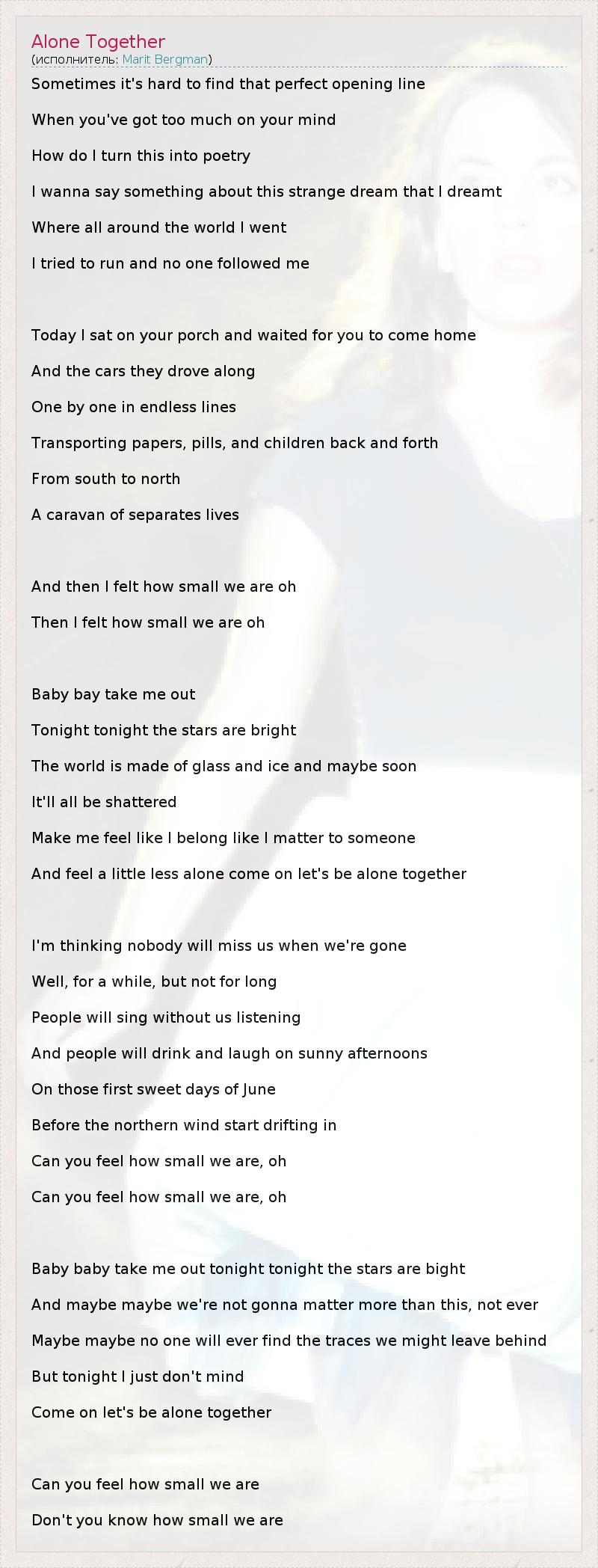 Sometimes it's hard to find that perfect opening line When you've got too much on your mind How do I turn this into poetry I wanna say something about this strange dream that I dreamt Where all around the world I went I tried to run and no one followed me Today I sat on your porch and waited for you to come home And the cars they drove along One by one in endless lines Transporting papers, pills, and children back and forth From south to north A caravan of separates lives And then I felt how small we are oh Then I felt how small we are oh Baby bay take me out Tonight tonight the stars are bright The world is made of glass and ice and maybe soon It'll all be shattered Make me feel like I belong like I matter to someone And feel a little less alone come on let's be alone together I'm thinking nobody will miss us when we're gone Well, for a while, but not for long People will sing without us listening And people will drink and laugh on sunny afternoons On those first sweet days of June Before the northern wind start drifting in Can you feel how small we are, oh Can you feel how small we are, oh Baby baby take me out tonight tonight the stars are bight And maybe maybe we're not gonna matter more than this, not ever Maybe maybe no one will ever find the traces we might leave behind But tonight I just don't mind Come on let's be alone together Can you feel how small we are Don't you know how small we are