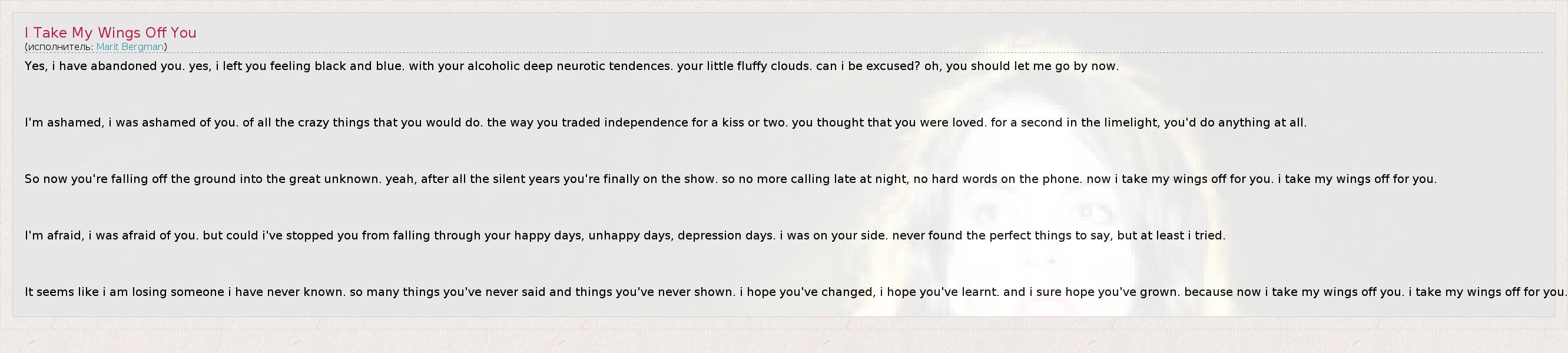 Yes, i have abandoned you. yes, i left you feeling black and blue. with your alcoholic deep neurotic tendences. your little fluffy clouds. can i be excused? oh, you should let me go by now. I'm ashamed, i was ashamed of you. of all the crazy things that you would do. the way you traded independence for a kiss or two. you thought that you were loved. for a second in the limelight, you'd do anything at all. So now you're falling off the ground into the great unknown. yeah, after all the silent years you're finally on the show. so no more calling late at night, no hard words on the phone. now i take my wings off for you. i take my wings off for you. I'm afraid, i was afraid of you. but could i've stopped you from falling through your happy days, unhappy days, depression days. i was on your side. never found the perfect things to say, but at least i tried. It seems like i am losing someone i have never known. so many things you've never said and things you've never shown. i hope you've changed, i hope you've learnt. and i sure hope you've grown. because now i take my wings off you. i take my wings off for you.