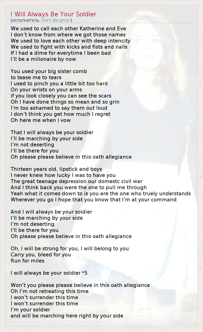 We used to call each other Katherine and Eve I don’t know from where we got those names We used to love each other with deep intencity We used to fight with kicks and fists and nails If I had a dime for everytime I been bad I’ll be a milionaire by now You used your big sister comb to tease me to tears I used to pinch you a little bit too hard On your wrists on your arms if you look closely you can see the scars Oh I have done things so mean and so grin I’m too ashamed to say them out loud I don’t think you get how much I regret Oh here me when I vow That I will always be your soldier I’ll be marching by your side I’m not deserting I’ll be there for you Oh please please believe in this oath allegiance Thirteen years old, lipstick and boys I never knew how lucky I was to have you The great teenage depression our domestc civil war And I think back you were the one to pull me through Yeah what it comes down to is you are the one who truely understands Wherever you go I hope that you know that I’m at your command And I will always be your soldier I’ll be marching by your side I’m not deserting I’ll be there for you Oh please please believe in this oath allegiance Oh, I will be strong for you, I will belong to you Carry you, bleed for you Run for miles I will always be your soldier *5 Won't you please please believe in this oath allegiance Oh I'm not retreating this time I won't surrender this time I won't surrender this time I'm your soldier and will be marching here right by your side