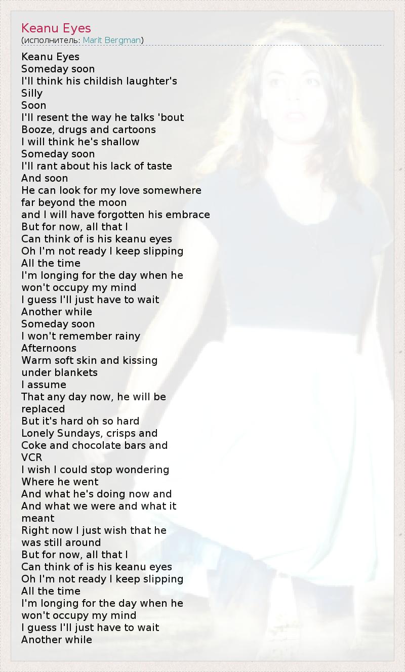 Keanu Eyes Someday soon I'll think his childish laughter's Silly Soon I'll resent the way he talks 'bout Booze, drugs and cartoons I will think he's shallow Someday soon I'll rant about his lack of taste And soon He can look for my love somewhere far beyond the moon and I will have forgotten his embrace But for now, all that I Can think of is his keanu eyes Oh I'm not ready I keep slipping All the time I'm longing for the day when he won't occupy my mind I guess I'll just have to wait Another while Someday soon I won't remember rainy Afternoons Warm soft skin and kissing under blankets I assume That any day now, he will be replaced But it's hard oh so hard Lonely Sundays, crisps and Coke and chocolate bars and VCR I wish I could stop wondering Where he went And what he's doing now and And what we were and what it meant Right now I just wish that he was still around But for now, all that I Can think of is his keanu eyes Oh I'm not ready I keep slipping All the time I'm longing for the day when he won't occupy my mind I guess I'll just have to wait Another while