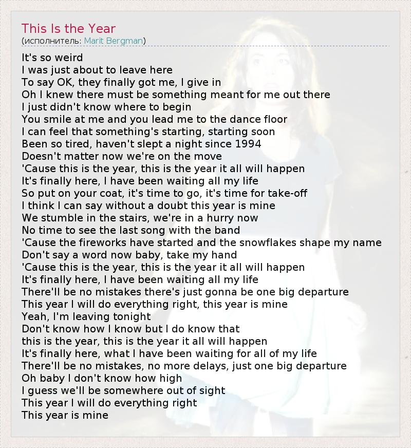 It's so weird I was just about to leave here To say OK, they finally got me, I give in Oh I knew there must be something meant for me out there I just didn't know where to begin You smile at me and you lead me to the dance floor I can feel that something's starting, starting soon Been so tired, haven't slept a night since 1994 Doesn't matter now we're on the move 'Cause this is the year, this is the year it all will happen It's finally here, I have been waiting all my life So put on your coat, it's time to go, it's time for take-off I think I can say without a doubt this year is mine We stumble in the stairs, we're in a hurry now No time to see the last song with the band 'Cause the fireworks have started and the snowflakes shape my name Don't say a word now baby, take my hand 'Cause this is the year, this is the year it all will happen It's finally here, I have been waiting all my life There'll be no mistakes there's just gonna be one big departure This year I will do everything right, this year is mine Yeah, I'm leaving tonight Don't know how I know but I do know that this is the year, this is the year it all will happen It's finally here, what I have been waiting for all of my life There'll be no mistakes, no more delays, just one big departure Oh baby I don't know how high I guess we'll be somewhere out of sight This year I will do everything right This year is mine