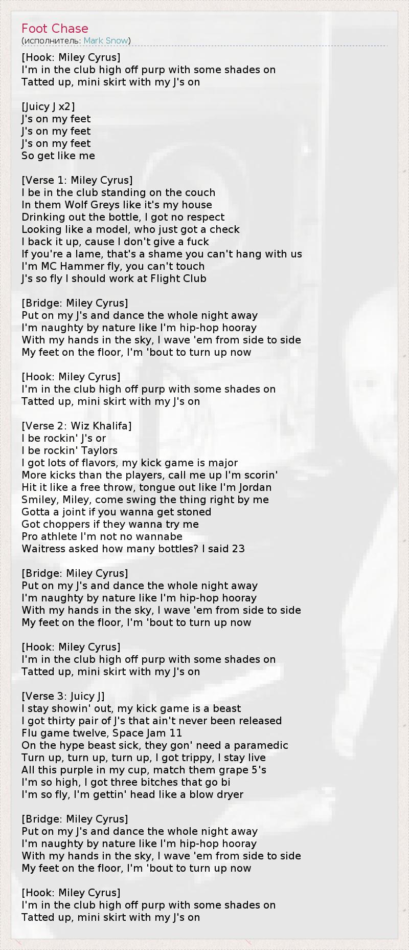 [Hook: Miley Cyrus] I'm in the club high off purp with some shades on Tatted up, mini skirt with my J's on [Juicy J x2] J's on my feet J's on my feet J's on my feet So get like me [Verse 1: Miley Cyrus] I be in the club standing on the couch In them Wolf Greys like it's my house Drinking out the bottle, I got no respect Looking like a model, who just got a check I back it up, cause I don't give a fuck If you're a lame, that's a shame you can't hang with us I'm MC Hammer fly, you can't touch J's so fly I should work at Flight Club [Bridge: Miley Cyrus] Put on my J's and dance the whole night away I'm naughty by nature like I'm hip-hop hooray With my hands in the sky, I wave 'em from side to side My feet on the floor, I'm 'bout to turn up now [Hook: Miley Cyrus] I'm in the club high off purp with some shades on Tatted up, mini skirt with my J's on [Verse 2: Wiz Khalifa] I be rockin' J's or I be rockin' Taylors I got lots of flavors, my kick game is major More kicks than the players, call me up I'm scorin' Hit it like a free throw, tongue out like I'm Jordan Smiley, Miley, come swing the thing right by me Gotta a joint if you wanna get stoned Got choppers if they wanna try me Pro athlete I'm not no wannabe Waitress asked how many bottles? I said 23 [Bridge: Miley Cyrus] Put on my J's and dance the whole night away I'm naughty by nature like I'm hip-hop hooray With my hands in the sky, I wave 'em from side to side My feet on the floor, I'm 'bout to turn up now [Hook: Miley Cyrus] I'm in the club high off purp with some shades on Tatted up, mini skirt with my J's on [Verse 3: Juicy J] I stay showin' out, my kick game is a beast I got thirty pair of J's that ain't never been released Flu game twelve, Space Jam 11 On the hype beast sick, they gon' need a paramedic Turn up, turn up, turn up, I got trippy, I stay live All this purple in my cup, match them grape 5's I'm so high, I got three bitches that go bi I'm so fly, I'm gettin' head like a blow dryer [Bridge: Miley Cyrus] Put on my J's and dance the whole night away I'm naughty by nature like I'm hip-hop hooray With my hands in the sky, I wave 'em from side to side My feet on the floor, I'm 'bout to turn up now [Hook: Miley Cyrus] I'm in the club high off purp with some shades on Tatted up, mini skirt with my J's on