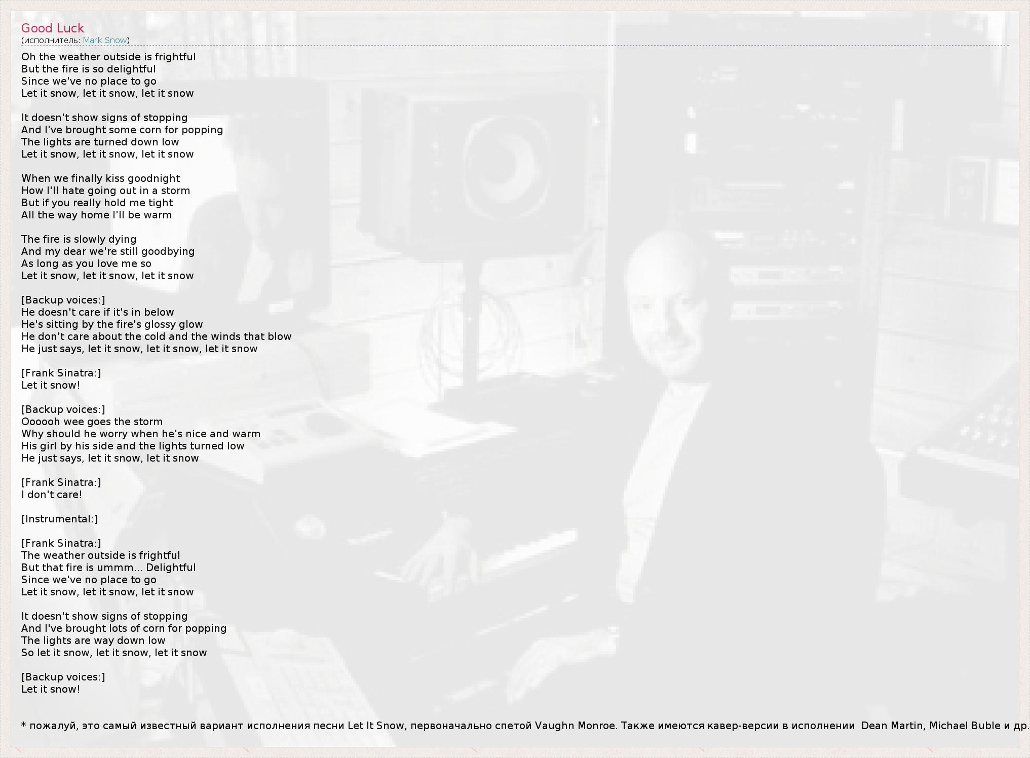 Oh the weather outside is frightful But the fire is so delightful Since we've no place to go Let it snow, let it snow, let it snow It doesn't show signs of stopping And I've brought some corn for popping The lights are turned down low Let it snow, let it snow, let it snow When we finally kiss goodnight How I'll hate going out in a storm But if you really hold me tight All the way home I'll be warm The fire is slowly dying And my dear we're still goodbying As long as you love me so Let it snow, let it snow, let it snow [Backup voices:] He doesn't care if it's in below He's sitting by the fire's glossy glow He don't care about the cold and the winds that blow He just says, let it snow, let it snow, let it snow [Frank Sinatra:] Let it snow! [Backup voices:] Oooooh wee goes the storm Why should he worry when he's nice and warm His girl by his side and the lights turned low He just says, let it snow, let it snow [Frank Sinatra:] I don't care! [Instrumental:] [Frank Sinatra:] The weather outside is frightful But that fire is ummm... Delightful Since we've no place to go Let it snow, let it snow, let it snow It doesn't show signs of stopping And I've brought lots of corn for popping The lights are way down low So let it snow, let it snow, let it snow [Backup voices:] Let it snow! * пожалуй, это самый известный вариант исполнения песни Let It Snow, первоначально спетой Vaughn Monroe. Также имеются кавер-версии в исполнении Dean Martin, Michael Buble и др.