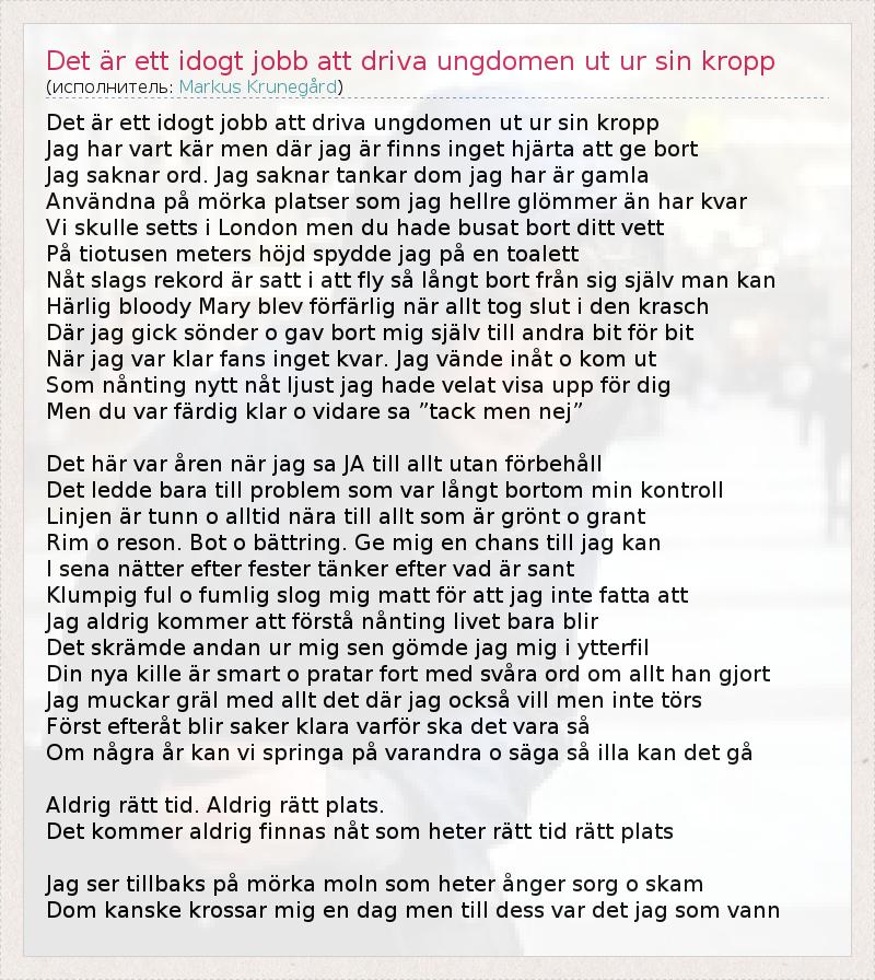 Это интересно:Маркус Крунегорд (родился 6 апреля 1979 года в Норрчёпинге, Швеция) - шведский певец и автор песен. Ранее был наиболее известен как лидер групп Laakso и HETS!. Он также принял участие в песне группы Säkert! Det kommer bara leda till nåt ont.2 апреля 2008 он выпустил свой дебютный соло-альбом Markusevangeliet,... продолжение