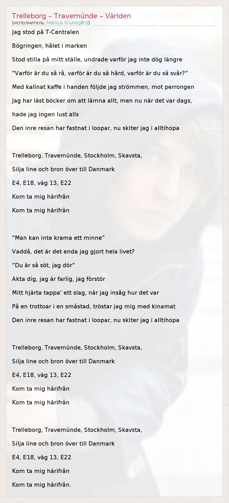 Jag stod på T-Centralen Bögringen, hålet i marken Stod stilla på mitt ställe, undrade varför jag inte dög längre "Varför är du så rå, varför är du så hård, varför är du så svår?" Med kallnat kaffe i handen följde jag strömmen, mot perrongen Jag har läst böcker om att lämna allt, men nu när det var dags, hade jag ingen lust alls Den inre resan har fastnat i loopar, nu skiter jag i alltihopa Trelleborg, Travemünde, Stockholm, Skavsta, Silja line och bron över till Danmark E4, E18, väg 13, E22 Kom ta mig härifrån Kom ta mig härifrån "Man kan inte krama ett minne" Vaddå, det är det enda jag gjort hela livet? "Du är så söt, jag dör" Akta dig, jag är farlig, jag förstör Mitt hjärta tappa' ett slag, när jag insåg hur det var På en trottoar i en småstad, tröstar jag mig med kinamat Den inre resan har fastnat i loopar, nu skiter jag i alltihopa Trelleborg, Travemünde, Stockholm, Skavsta, Silja line och bron över till Danmark E4, E18, väg 13, E22 Kom ta mig härifrån Kom ta mig härifrån Trelleborg, Travemünde, Stockholm, Skavsta, Silja line och bron över till Danmark E4, E18, väg 13, E22 Kom ta mig härifrån Kom ta mig härifrån.