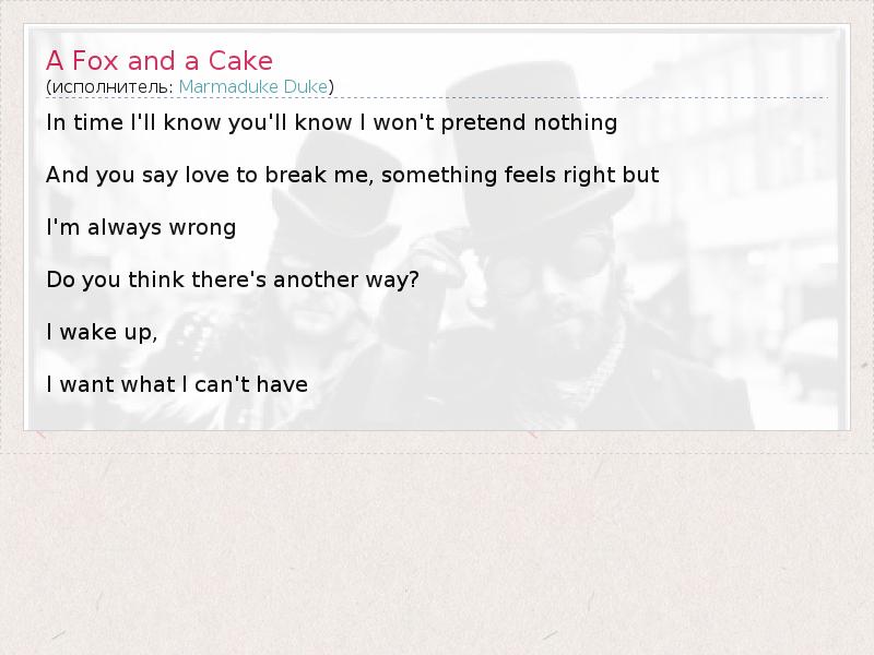А как ты думаешь, о чем песня "A Fox and a Cake" ?