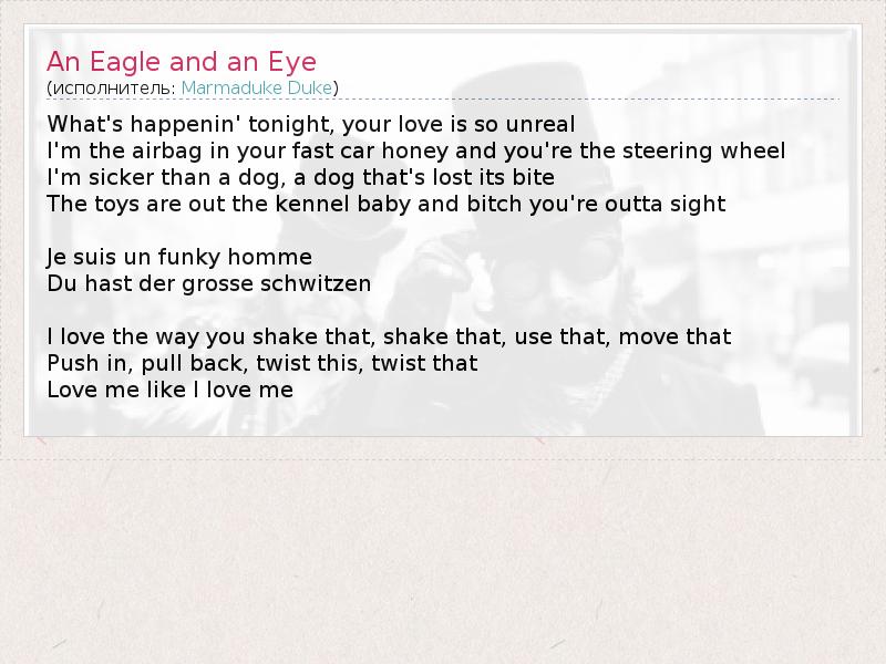 What's happenin' tonight, your love is so unreal I'm the airbag in your fast car honey and you're the steering wheel I'm sicker than a dog, a dog that's lost its bite The toys are out the kennel baby and bitch you're outta sight Je suis un funky homme Du hast der grosse schwitzen I love the way you shake that, shake that, use that, move that Push in, pull back, twist this, twist that Love me like I love me