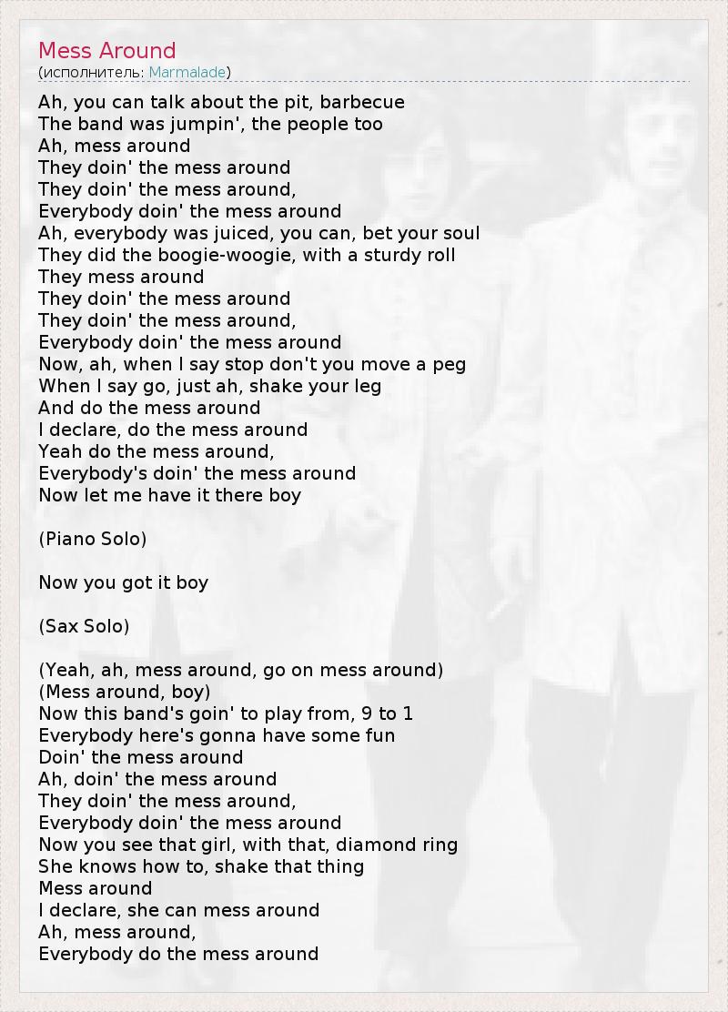 Ah, you can talk about the pit, barbecue The band was jumpin', the people too Ah, mess around They doin' the mess around They doin' the mess around, Everybody doin' the mess around Ah, everybody was juiced, you can, bet your soul They did the boogie-woogie, with a sturdy roll They mess around They doin' the mess around They doin' the mess around, Everybody doin' the mess around Now, ah, when I say stop don't you move a peg When I say go, just ah, shake your leg And do the mess around I declare, do the mess around Yeah do the mess around, Everybody's doin' the mess around Now let me have it there boy (Piano Solo) Now you got it boy (Sax Solo) (Yeah, ah, mess around, go on mess around) (Mess around, boy) Now this band's goin' to play from, 9 to 1 Everybody here's gonna have some fun Doin' the mess around Ah, doin' the mess around They doin' the mess around, Everybody doin' the mess around Now you see that girl, with that, diamond ring She knows how to, shake that thing Mess around I declare, she can mess around Ah, mess around, Everybody do the mess around