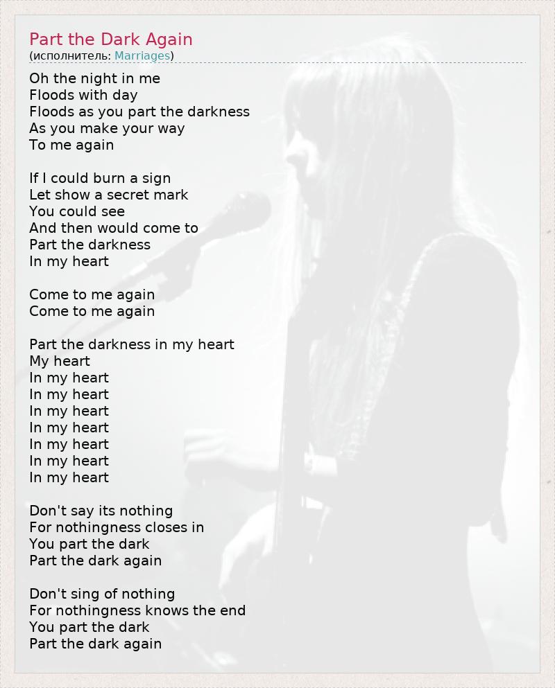 Oh the night in me Floods with day Floods as you part the darkness As you make your way To me again If I could burn a sign Let show a secret mark You could see And then would come to Part the darkness In my heart Come to me again Come to me again Part the darkness in my heart My heart In my heart In my heart In my heart In my heart In my heart In my heart In my heart Don't say its nothing For nothingness closes in You part the dark Part the dark again Don't sing of nothing For nothingness knows the end You part the dark Part the dark again