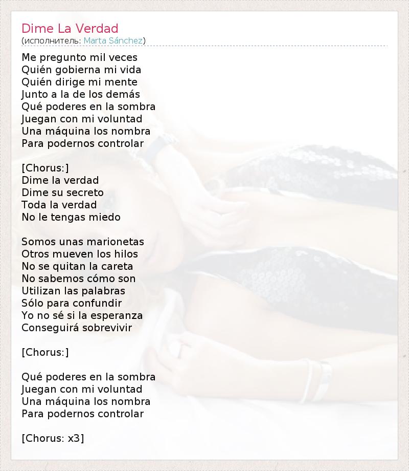 Me pregunto mil veces Quién gobierna mi vida Quién dirige mi mente Junto a la de los demás Qué poderes en la sombra Juegan con mi voluntad Una máquina los nombra Para podernos controlar [Chorus:] Dime la verdad Dime su secreto Toda la verdad No le tengas miedo Somos unas marionetas Otros mueven los hilos No se quitan la careta No sabemos cómo son Utilizan las palabras Sólo para confundir Yo no sé si la esperanza Conseguirá sobrevivir [Chorus:] Qué poderes en la sombra Juegan con mi voluntad Una máquina los nombra Para podernos controlar [Chorus: x3]