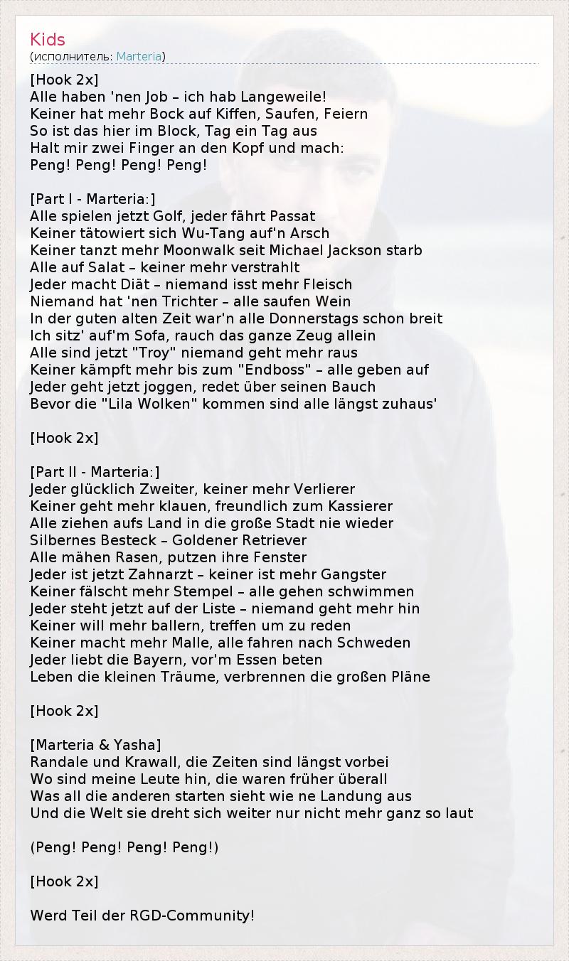 Это интересно:Marteria это псевдоним Мартена Ласини (Marten Laciny). Xип-хоп - это его уже четвертая успешная карьера. Мартен родился 4 декабря 1982 года на севере Германии в Ростоке. В детстве играл в футбол, причем настолько хорошо, что мог стать профессионалом. Но от карьеры футболиста он отказался и стал фотомоделью. Юноша жил в Нью-Йорке и фотографировался для таких марок как Hugo Boss и Diesel. В 2002 году он... продолжение