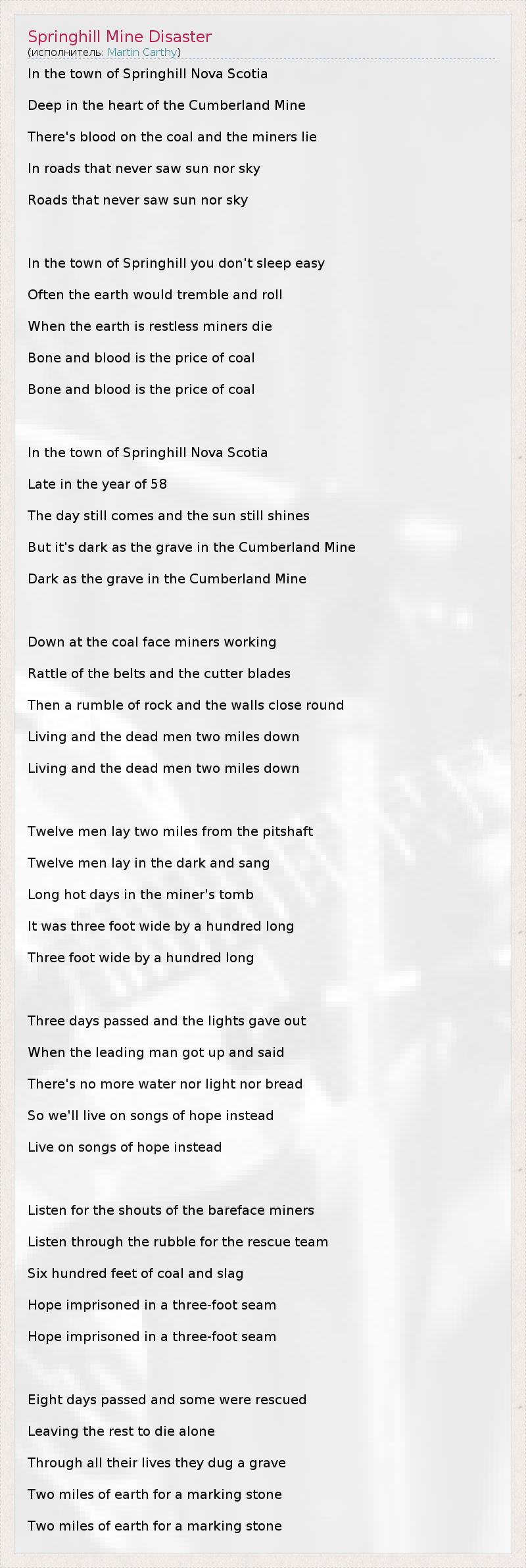 In the town of Springhill Nova Scotia Deep in the heart of the Cumberland Mine There's blood on the coal and the miners lie In roads that never saw sun nor sky Roads that never saw sun nor sky In the town of Springhill you don't sleep easy Often the earth would tremble and roll When the earth is restless miners die Bone and blood is the price of coal Bone and blood is the price of coal In the town of Springhill Nova Scotia Late in the year of 58 The day still comes and the sun still shines But it's dark as the grave in the Cumberland Mine Dark as the grave in the Cumberland Mine Down at the coal face miners working Rattle of the belts and the cutter blades Then a rumble of rock and the walls close round Living and the dead men two miles down Living and the dead men two miles down Twelve men lay two miles from the pitshaft Twelve men lay in the dark and sang Long hot days in the miner's tomb It was three foot wide by a hundred long Three foot wide by a hundred long Three days passed and the lights gave out When the leading man got up and said There's no more water nor light nor bread So we'll live on songs of hope instead Live on songs of hope instead Listen for the shouts of the bareface miners Listen through the rubble for the rescue team Six hundred feet of coal and slag Hope imprisoned in a three-foot seam Hope imprisoned in a three-foot seam Eight days passed and some were rescued Leaving the rest to die alone Through all their lives they dug a grave Two miles of earth for a marking stone Two miles of earth for a marking stone