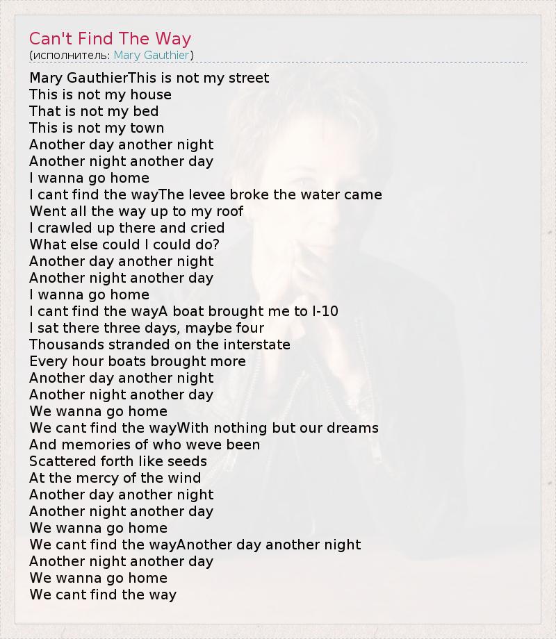 Mary GauthierThis is not my street This is not my house That is not my bed This is not my town Another day another night Another night another day I wanna go home I cant find the wayThe levee broke the water came Went all the way up to my roof I crawled up there and cried What else could I could do? Another day another night Another night another day I wanna go home I cant find the wayA boat brought me to I-10 I sat there three days, maybe four Thousands stranded on the interstate Every hour boats brought more Another day another night Another night another day We wanna go home We cant find the wayWith nothing but our dreams And memories of who weve been Scattered forth like seeds At the mercy of the wind Another day another night Another night another day We wanna go home We cant find the wayAnother day another night Another night another day We wanna go home We cant find the way
