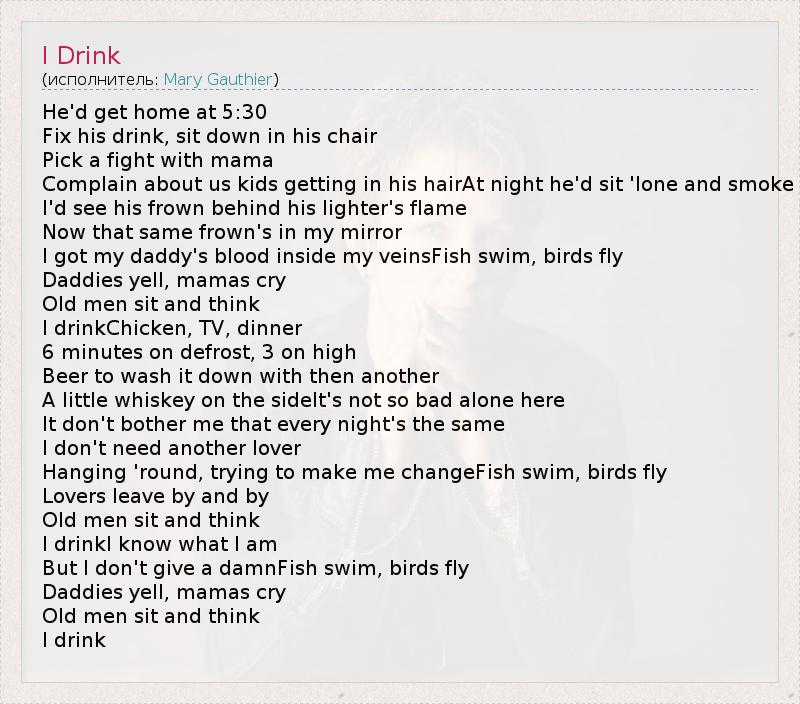 He'd get home at 5:30 Fix his drink, sit down in his chair Pick a fight with mama Complain about us kids getting in his hairAt night he'd sit 'lone and smoke I'd see his frown behind his lighter's flame Now that same frown's in my mirror I got my daddy's blood inside my veinsFish swim, birds fly Daddies yell, mamas cry Old men sit and think I drinkChicken, TV, dinner 6 minutes on defrost, 3 on high Beer to wash it down with then another A little whiskey on the sideIt's not so bad alone here It don't bother me that every night's the same I don't need another lover Hanging 'round, trying to make me changeFish swim, birds fly Lovers leave by and by Old men sit and think I drinkI know what I am But I don't give a damnFish swim, birds fly Daddies yell, mamas cry Old men sit and think I drink