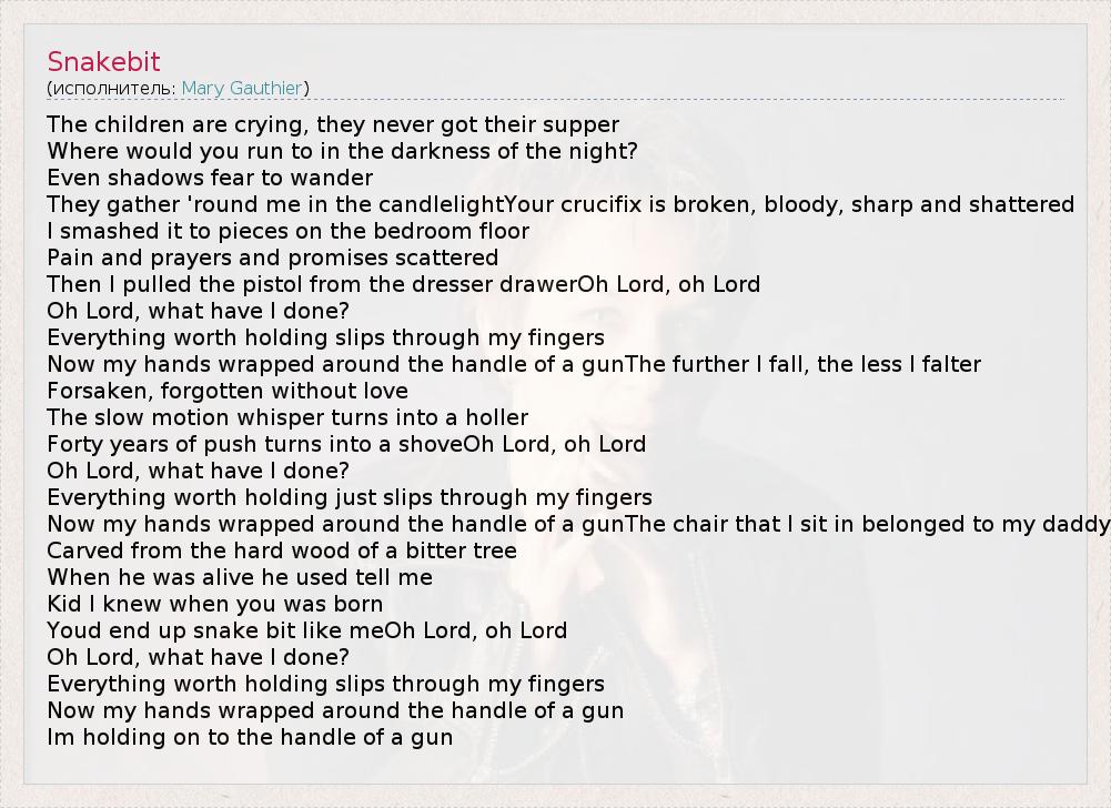 The children are crying, they never got their supper Where would you run to in the darkness of the night? Even shadows fear to wander They gather 'round me in the candlelightYour crucifix is broken, bloody, sharp and shattered I smashed it to pieces on the bedroom floor Pain and prayers and promises scattered Then I pulled the pistol from the dresser drawerOh Lord, oh Lord Oh Lord, what have I done? Everything worth holding slips through my fingers Now my hands wrapped around the handle of a gunThe further I fall, the less I falter Forsaken, forgotten without love The slow motion whisper turns into a holler Forty years of push turns into a shoveOh Lord, oh Lord Oh Lord, what have I done? Everything worth holding just slips through my fingers Now my hands wrapped around the handle of a gunThe chair that I sit in belonged to my daddy Carved from the hard wood of a bitter tree When he was alive he used tell me Kid I knew when you was born Youd end up snake bit like meOh Lord, oh Lord Oh Lord, what have I done? Everything worth holding slips through my fingers Now my hands wrapped around the handle of a gun Im holding on to the handle of a gun