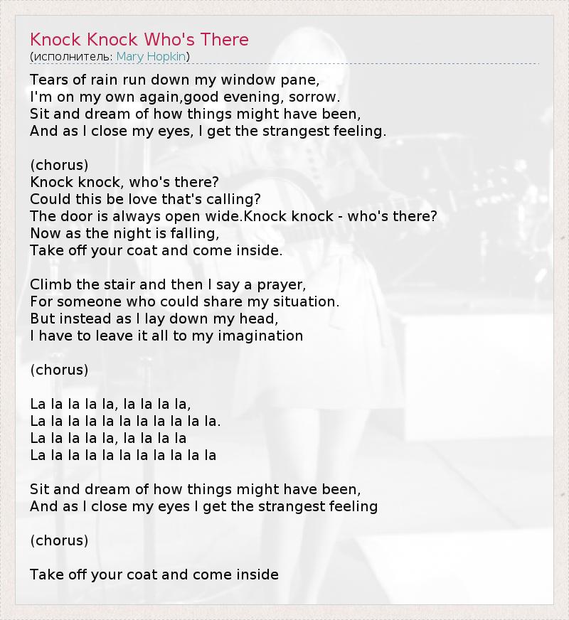 Tears of rain run down my window pane, I'm on my own again,good evening, sorrow. Sit and dream of how things might have been, And as I close my eyes, I get the strangest feeling. (chorus) Knock knock, who's there? Could this be love that's calling? The door is always open wide.Knock knock - who's there? Now as the night is falling, Take off your coat and come inside. Climb the stair and then I say a prayer, For someone who could share my situation. But instead as I lay down my head, I have to leave it all to my imagination (chorus) La la la la la, la la la la, La la la la la la la la la la la. La la la la la, la la la la La la la la la la la la la la la Sit and dream of how things might have been, And as I close my eyes I get the strangest feeling (chorus) Take off your coat and come inside