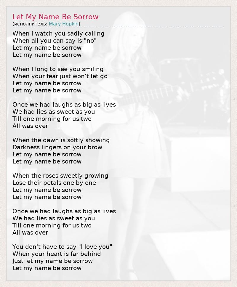 When I watch you sadly calling When all you can say is "no" Let my name be sorrow Let my name be sorrow When I long to see you smiling When your fear just won't let go Let my name be sorrow Let my name be sorrow Once we had laughs as big as lives We had lies as sweet as you Till one morning for us two All was over When the dawn is softly showing Darkness lingers on your brow Let my name be sorrow Let my name be sorrow When the roses sweetly growing Lose their petals one by one Let my name be sorrow Let my name be sorrow Once we had laughs as big as lives We had lies as sweet as you Till one morning for us two All was over You don't have to say "I love you" When your heart is far behind Just let my name be sorrow Let my name be sorrow