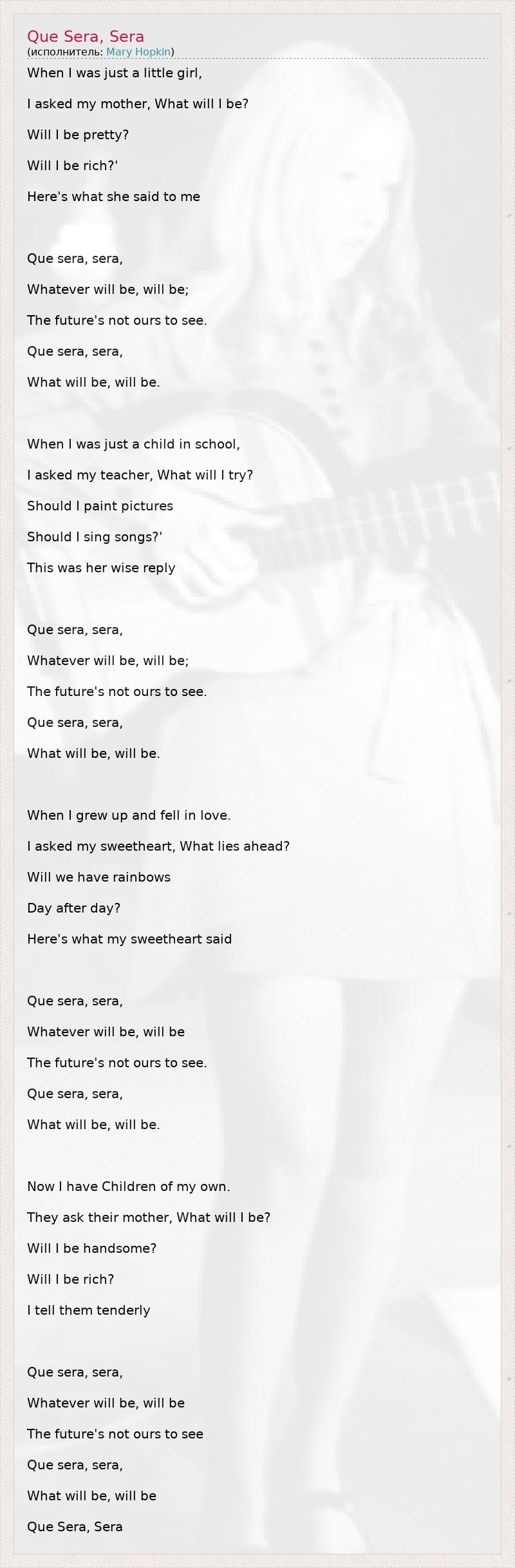 When I was just a little girl, I asked my mother, What will I be? Will I be pretty? Will I be rich?' Here's what she said to me Que sera, sera, Whatever will be, will be; The future's not ours to see. Que sera, sera, What will be, will be. When I was just a child in school, I asked my teacher, What will I try? Should I paint pictures Should I sing songs?' This was her wise reply Que sera, sera, Whatever will be, will be; The future's not ours to see. Que sera, sera, What will be, will be. When I grew up and fell in love. I asked my sweetheart, What lies ahead? Will we have rainbows Day after day? Here's what my sweetheart said Que sera, sera, Whatever will be, will be The future's not ours to see. Que sera, sera, What will be, will be. Now I have Children of my own. They ask their mother, What will I be? Will I be handsome? Will I be rich? I tell them tenderly Que sera, sera, Whatever will be, will be The future's not ours to see Que sera, sera, What will be, will be Que Sera, Sera