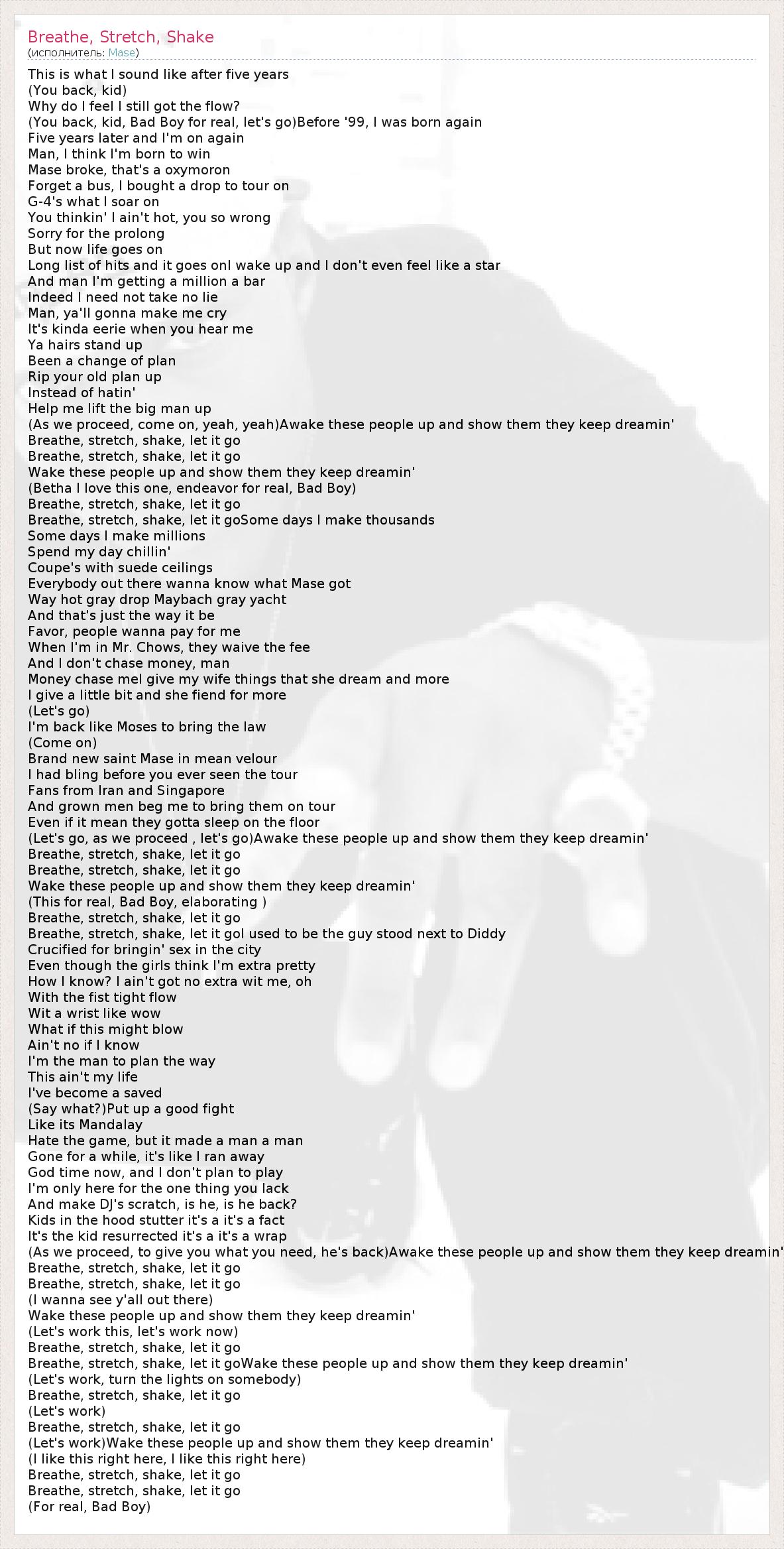 This is what I sound like after five years (You back, kid) Why do I feel I still got the flow? (You back, kid, Bad Boy for real, let's go)Before '99, I was born again Five years later and I'm on again Man, I think I'm born to win Mase broke, that's a oxymoron Forget a bus, I bought a drop to tour on G-4's what I soar on You thinkin' I ain't hot, you so wrong Sorry for the prolong But now life goes on Long list of hits and it goes onI wake up and I don't even feel like a star And man I'm getting a million a bar Indeed I need not take no lie Man, ya'll gonna make me cry It's kinda eerie when you hear me Ya hairs stand up Been a change of plan Rip your old plan up Instead of hatin' Help me lift the big man up (As we proceed, come on, yeah, yeah)Awake these people up and show them they keep dreamin' Breathe, stretch, shake, let it go Breathe, stretch, shake, let it go Wake these people up and show them they keep dreamin' (Betha I love this one, endeavor for real, Bad Boy) Breathe, stretch, shake, let it go Breathe, stretch, shake, let it goSome days I make thousands Some days I make millions Spend my day chillin' Coupe's with suede ceilings Everybody out there wanna know what Mase got Way hot gray drop Maybach gray yacht And that's just the way it be Favor, people wanna pay for me When I'm in Mr. Chows, they waive the fee And I don't chase money, man Money chase meI give my wife things that she dream and more I give a little bit and she fiend for more (Let's go) I'm back like Moses to bring the law (Come on) Brand new saint Mase in mean velour I had bling before you ever seen the tour Fans from Iran and Singapore And grown men beg me to bring them on tour Even if it mean they gotta sleep on the floor (Let's go, as we proceed , let's go)Awake these people up and show them they keep dreamin' Breathe, stretch, shake, let it go Breathe, stretch, shake, let it go Wake these people up and show them they keep dreamin' (This for real, Bad Boy, elaborating ) Breathe, stretch, shake, let it go Breathe, stretch, shake, let it goI used to be the guy stood next to Diddy Crucified for bringin' sex in the city Even though the girls think I'm extra pretty How I know? I ain't got no extra wit me, oh With the fist tight flow Wit a wrist like wow What if this might blow Ain't no if I know I'm the man to plan the way This ain't my life I've become a saved (Say what?)Put up a good fight Like its Mandalay Hate the game, but it made a man a man Gone for a while, it's like I ran away God time now, and I don't plan to play I'm only here for the one thing you lack And make DJ's scratch, is he, is he back? Kids in the hood stutter it's a it's a fact It's the kid resurrected it's a it's a wrap (As we proceed, to give you what you need, he's back)Awake these people up and show them they keep dreamin' Breathe, stretch, shake, let it go Breathe, stretch, shake, let it go (I wanna see y'all out there) Wake these people up and show them they keep dreamin' (Let's work this, let's work now) Breathe, stretch, shake, let it go Breathe, stretch, shake, let it goWake these people up and show them they keep dreamin' (Let's work, turn the lights on somebody) Breathe, stretch, shake, let it go (Let's work) Breathe, stretch, shake, let it go (Let's work)Wake these people up and show them they keep dreamin' (I like this right here, I like this right here) Breathe, stretch, shake, let it go Breathe, stretch, shake, let it go (For real, Bad Boy)