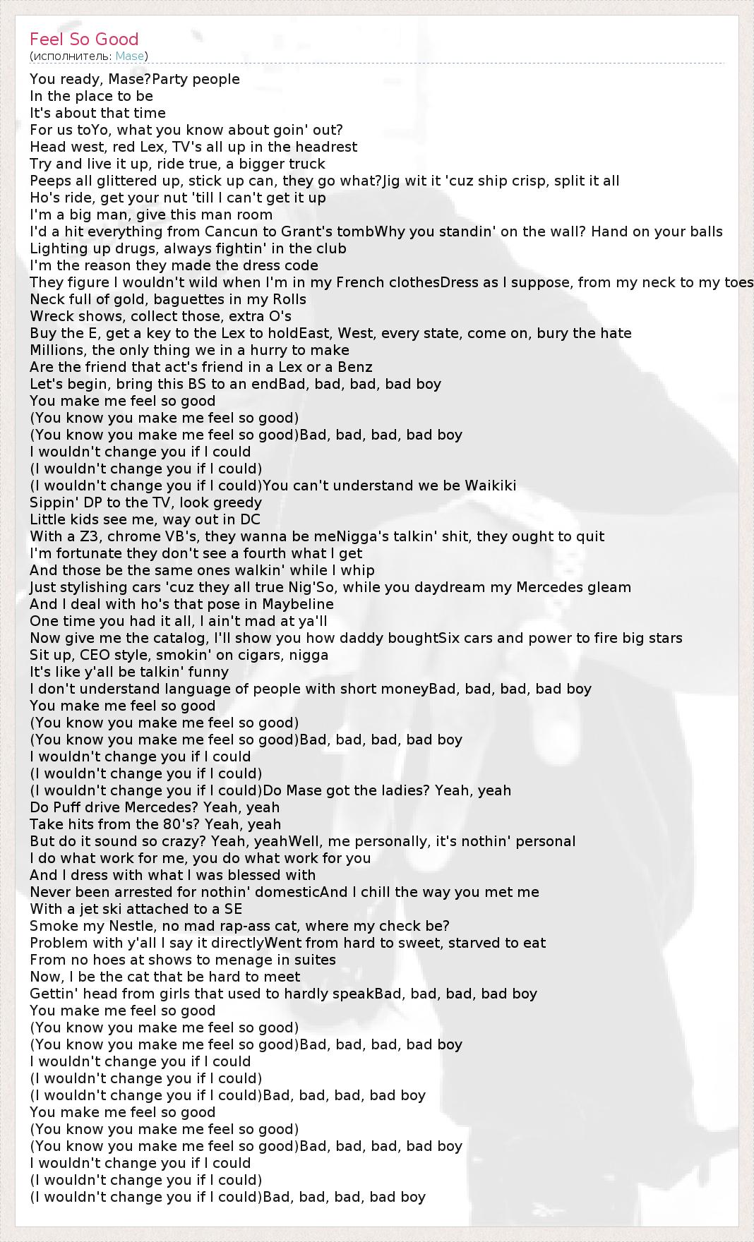 Это интересно:Реальное имя Mase`а – Mason Durrell Betha, он родился в Jacksonville, FL, 27 августа, 1977 года. Его семья переехала в суровый район Гарлем, когда ему было лишь 5 лет, но в 13 лет парнишку отправили обратно во Флориду, так как, по словам родителей, «он связался с ненужными людьми». Два года спустя он вновь вернулся в New York, и начал читать рэп, для того чтоб развлечь членов своей школьной баскетбольной команды. Мэйз,... продолжение