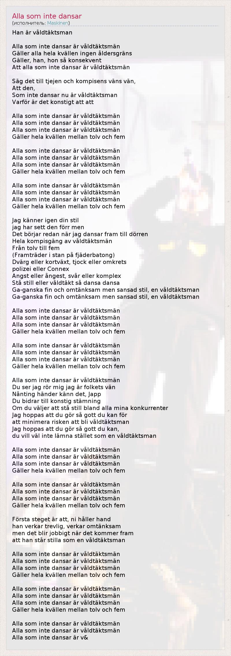 Han är våldtäktsman Alla som inte dansar är våldtäktsmän Gäller alla hela kvällen ingen åldersgräns Gäller, han, hon så konsekvent Att alla som inte dansar är våldtäktsmän Säg det till tjejen och kompisens väns vän, Att den, Som inte dansar nu är våldtäktsman Varför är det konstigt att att Alla som inte dansar är våldtäktsmän Alla som inte dansar är våldtäktsmän Alla som inte dansar är våldtäktsmän Gäller hela kvällen mellan tolv och fem Alla som inte dansar är våldtäktsmän Alla som inte dansar är våldtäktsmän Alla som inte dansar är våldtäktsmän Gäller hela kvällen mellan tolv och fem Alla som inte dansar är våldtäktsmän Alla som inte dansar är våldtäktsmän Alla som inte dansar är våldtäktsmän Gäller hela kvällen mellan tolv och fem Jag känner igen din stil jag har sett den förr men Det börjar redan när jag dansar fram till dörren Hela kompisgäng av våldtäktsmän Från tolv till fem (Framträder i stan på fjäderbatong) Dvärg eller kortväxt, tjock eller omkrets polizei eller Connex Angst eller ångest, svår eller komplex Stå still eller våldtäkt så dansa dansa Ga-ganska fin och omtänksam men sansad stil, en våldtäktsman Ga-ganska fin och omtänksam men sansad stil, en våldtäktsman Alla som inte dansar är våldtäktsmän Alla som inte dansar är våldtäktsmän Alla som inte dansar är våldtäktsmän Gäller hela kvällen mellan tolv och fem Alla som inte dansar är våldtäktsmän Alla som inte dansar är våldtäktsmän Alla som inte dansar är våldtäktsmän Gäller hela kvällen mellan tolv och fem Alla som inte dansar är våldtäktsmän Du ser jag rör mig jag är folkets vän Nånting händer känn det, Japp Du bidrar till konstig stämning Om du väljer att stå still bland alla mina konkurrenter Jag hoppas att du gör så gott du kan för att minimera risken att bli våldtäktsman Jag hoppas att du gör så gott du kan, du vill väl inte lämna stället som en våldtäktsman Alla som inte dansar är våldtäktsmän Alla som inte dansar är våldtäktsmän Alla som inte dansar är våldtäktsmän Gäller hela kvällen mellan tolv och fem Alla som inte dansar är våldtäktsmän Alla som inte dansar är våldtäktsmän Alla som inte dansar är våldtäktsmän Gäller hela kvällen mellan tolv och fem Första steget är att, ni håller hand han verkar trevlig, verkar omtänksam men det blir jobbigt när det kommer fram att han står stilla som en våldtäktsman Alla som inte dansar är våldtäktsmän Alla som inte dansar är våldtäktsmän Alla som inte dansar är våldtäktsmän Gäller hela kvällen mellan tolv och fem Alla som inte dansar är våldtäktsmän Alla som inte dansar är våldtäktsmän Alla som inte dansar är våldtäktsmän Gäller hela kvällen mellan tolv och fem Alla som inte dansar är våldtäktsmän Alla som inte dansar är våldtäktsmän Alla som inte dansar är v&