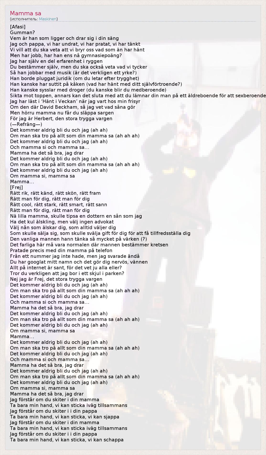 [Afasi] Gumman? Vem är han som ligger och drar sig i din säng Jag och pappa, vi har undrat, vi har pratat, vi har tänkt Vi vill att du ska veta att vi bryr oss vad som än har hänt Men har jobb, har han ens nå gymnasiepoäng? Jag har själv en del erfarenhet i ryggen Du bestämmer själv, men du ska också veta vad vi tycker Så han jobbar med musik (är det verkligen ett yrke?) Han borde pluggat juridik (om du letar efter trygghet) Han kanske har suttit på kåken (vad har hänt med ditt självförtroende?) Han kanske sysslar med droger (du kanske blir du medberoende) Sikta mot toppen, annars kan det sluta med att du lämnar din man på ett äldreboende för att sexberoende Jag har läst i ‘Hänt i Veckan’ när jag vart hos min frisyr Om den där David Beckham, så jag vet vad såna gör Men hörru mamma nu får du släppa sargen För jag är Herbert, den stora trygga vargen (—Refräng—) Det kommer aldrig bli du och jag (ah ah) Om man ska tro på allt som din mamma sa (ah ah ah) Det kommer aldrig bli du och jag (ah ah) Och mamma si och mamma sa… Mamma ha det så bra, jag drar Det kommer aldrig bli du och jag (ah ah) Om man ska tro på allt som din mamma sa (ah ah ah) Det kommer aldrig bli du och jag (ah ah) Om mamma si, mamma sa Mamma… [Frej] Rätt rik, rätt känd, rätt skön, rätt fram Rätt man för dig, rätt man för dig Rätt cool, rätt stark, rätt smart, rätt sann Rätt man för dig, rätt man för dig Nä lilla mamma, skulle tipsa en dottern en sån som jag Ha det kul älskling, men välj ingen advokat Välj nån som älskar dig, som alltid väljer dig Som skulle sälja sig, som skulle svälja gift för dig för att få tillfredsställa dig Den vanliga mannen hann tänka så mycket på värken (?) Det farliga här må vara normalen där mannen bestämmer kretsen Pratade precis med din mamma på telefon Från ett nummer jag inte hade, men jag svarade ändå Du har googlat mitt namn och det gör dig nervös, vännen Allt på internet är sant, för det vet ju alla eller? Tror du verkligen att jag bor i ett skjul i parken? Nej jag är Frej, det stora trygga vargen Det kommer aldrig bli du och jag (ah ah) Om man ska tro på allt som din mamma sa (ah ah ah) Det kommer aldrig bli du och jag (ah ah) Och mamma si och mamma sa… Mamma ha det så bra, jag drar Det kommer aldrig bli du och jag (ah ah) Om man ska tro på allt som din mamma sa (ah ah ah) Det kommer aldrig bli du och jag (ah ah) Om mamma si, mamma sa Mamma… Det kommer aldrig bli du och jag (ah ah) Om man ska tro på allt som din mamma sa (ah ah ah) Det kommer aldrig bli du och jag (ah ah) Och mamma si och mamma sa… Mamma ha det så bra, jag drar Det kommer aldrig bli du och jag (ah ah) Om man ska tro på allt som din mamma sa (ah ah ah) Det kommer aldrig bli du och jag (ah ah) Om mamma si, mamma sa Mamma ha det så bra, jag drar Jag förstår om du skiter i din mamma Ta bara min hand, vi kan sticka iväg tillsammans Jag förstår om du skiter i i din pappa Ta bara min hand, vi kan sticka, vi kan sjappa Jag förstår om du skiter i din mamma Ta bara min hand, vi kan sticka iväg tillsammans Jag förstår om du skiter i i din pappa Ta bara min hand, vi kan sticka, vi kan schappa