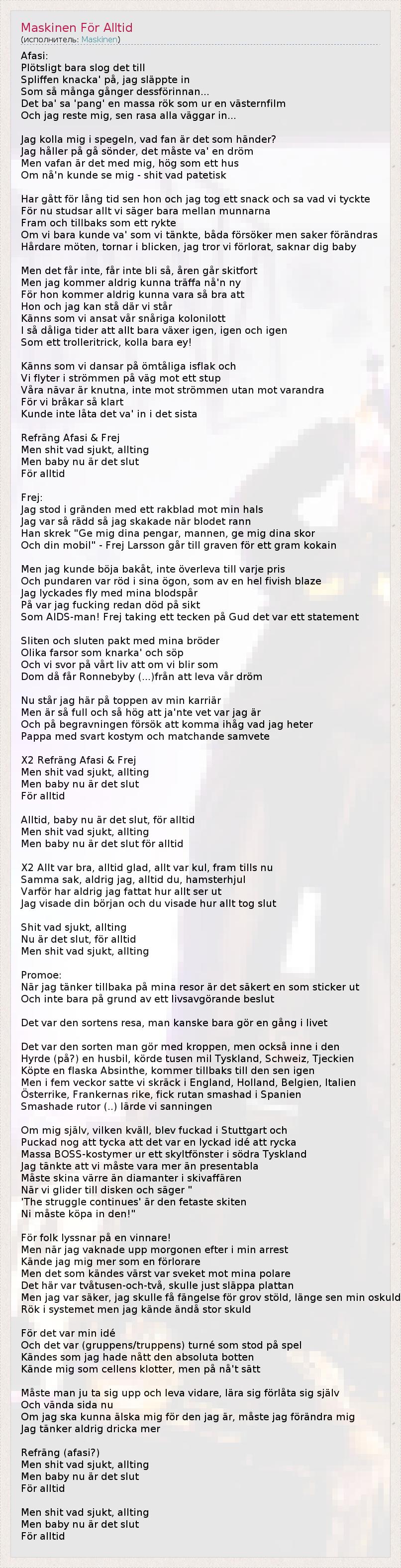 Afasi: Plötsligt bara slog det till Spliffen knacka' på, jag släppte in Som så många gånger dessförinnan... Det ba' sa 'pang' en massa rök som ur en västernfilm Och jag reste mig, sen rasa alla väggar in... Jag kolla mig i spegeln, vad fan är det som händer? Jag håller på gå sönder, det måste va' en dröm Men vafan är det med mig, hög som ett hus Om nå'n kunde se mig - shit vad patetisk Har gått för lång tid sen hon och jag tog ett snack och sa vad vi tyckte För nu studsar allt vi säger bara mellan munnarna Fram och tillbaks som ett rykte Om vi bara kunde va' som vi tänkte, båda försöker men saker förändras Hårdare möten, tornar i blicken, jag tror vi förlorat, saknar dig baby Men det får inte, får inte bli så, åren går skitfort Men jag kommer aldrig kunna träffa nå'n ny För hon kommer aldrig kunna vara så bra att Hon och jag kan stå där vi står Känns som vi ansat vår snåriga kolonilott I så dåliga tider att allt bara växer igen, igen och igen Som ett trolleritrick, kolla bara ey! Känns som vi dansar på ömtåliga isflak och Vi flyter i strömmen på väg mot ett stup Våra nävar är knutna, inte mot strömmen utan mot varandra För vi bråkar så klart Kunde inte låta det va' in i det sista Refräng Afasi & Frej Men shit vad sjukt, allting Men baby nu är det slut För alltid Frej: Jag stod i gränden med ett rakblad mot min hals Jag var så rädd så jag skakade när blodet rann Han skrek "Ge mig dina pengar, mannen, ge mig dina skor Och din mobil" - Frej Larsson går till graven för ett gram kokain Men jag kunde böja bakåt, inte överleva till varje pris Och pundaren var röd i sina ögon, som av en hel fivish blaze Jag lyckades fly med mina blodspår På var jag fucking redan död på sikt Som AIDS-man! Frej taking ett tecken på Gud det var ett statement Sliten och sluten pakt med mina bröder Olika farsor som knarka' och söp Och vi svor på vårt liv att om vi blir som Dom då får Ronnebyby (...)från att leva vår dröm Nu står jag här på toppen av min karriär Men är så full och så hög att ja'nte vet var jag är Och på begravningen försök att komma ihåg vad jag heter Pappa med svart kostym och matchande samvete X2 Refräng Afasi & Frej Men shit vad sjukt, allting Men baby nu är det slut För alltid Alltid, baby nu är det slut, för alltid Men shit vad sjukt, allting Men baby nu är det slut för alltid X2 Allt var bra, alltid glad, allt var kul, fram tills nu Samma sak, aldrig jag, alltid du, hamsterhjul Varför har aldrig jag fattat hur allt ser ut Jag visade din början och du visade hur allt tog slut Shit vad sjukt, allting Nu är det slut, för alltid Men shit vad sjukt, allting Promoe: När jag tänker tillbaka på mina resor är det säkert en som sticker ut Och inte bara på grund av ett livsavgörande beslut Det var den sortens resa, man kanske bara gör en gång i livet Det var den sorten man gör med kroppen, men också inne i den Hyrde (på?) en husbil, körde tusen mil Tyskland, Schweiz, Tjeckien Köpte en flaska Absinthe, kommer tillbaks till den sen igen Men i fem veckor satte vi skräck i England, Holland, Belgien, Italien Österrike, Frankernas rike, fick rutan smashad i Spanien Smashade rutor (..) lärde vi sanningen Om mig själv, vilken kväll, blev fuckad i Stuttgart och Puckad nog att tycka att det var en lyckad idé att rycka Massa BOSS-kostymer ur ett skyltfönster i södra Tyskland Jag tänkte att vi måste vara mer än presentabla Måste skina värre än diamanter i skivaffären När vi glider till disken och säger " 'The struggle continues' är den fetaste skiten Ni måste köpa in den!" För folk lyssnar på en vinnare! Men när jag vaknade upp morgonen efter i min arrest Kände jag mig mer som en förlorare Men det som kändes värst var sveket mot mina polare Det här var tvåtusen-och-två, skulle just släppa plattan Men jag var säker, jag skulle få fängelse för grov stöld, länge sen min oskuld Rök i systemet men jag kände ändå stor skuld För det var min idé Och det var (gruppens/truppens) turné som stod på spel Kändes som jag hade nått den absoluta botten Kände mig som cellens klotter, men på nå't sätt Måste man ju ta sig upp och leva vidare, lära sig förlåta sig själv Och vända sida nu Om jag ska kunna älska mig för den jag är, måste jag förändra mig Jag tänker aldrig dricka mer Refräng (afasi?) Men shit vad sjukt, allting Men baby nu är det slut För alltid Men shit vad sjukt, allting Men baby nu är det slut För alltid