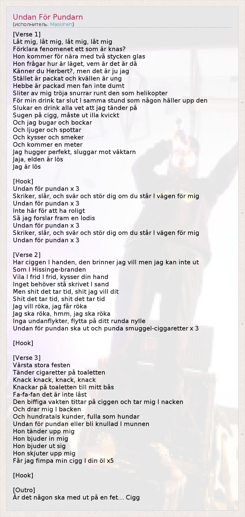 [Verse 1] Låt mig, låt mig, låt mig, låt mig Förklara fenomenet ett som är knas? Hon kommer för nära med två stycken glas Hon frågar hur är läget, vem är det är då Känner du Herbert?, men det är ju jag Stället är packat och kvällen är ung Hebbe är packad men fan inte dumt Sliter av mig tröja snurrar runt den som helikopter För min drink tar slut I samma stund som någon häller upp den Slukar en drink alla vet att jag tänder på Sugen på cigg, måste ut illa kvickt Och jag bugar och bockar Och ljuger och spottar Och kysser och smeker Och kommer en meter Jag hugger perfekt, sluggar mot väktarn Jaja, elden är lös Jag är lös [Hook] Undan för pundan x 3 Skriker, slår, och svär och stör dig om du står I vägen för mig Undan för pundan x 3 Inte här för att ha roligt Så jag forslar fram en lodis Undan för pundan x 3 Skriker, slår, och svär och stör dig om du står I vägen för mig Undan för pundan x 3 [Verse 2] Har ciggen I handen, den brinner jag vill men jag kan inte ut Som I Hissinge-branden Vila I frid I frid, kysser din hand Inget behöver stå skrivet I sand Men shit det tar tid, shit jag vill dit Shit det tar tid, shit det tar tid Jag vill röka, jag får röka Jag ska röka, hmm, jag ska röka Inga undanflykter, flytta på ditt runda nylle Undan för pundan ska ut och punda smuggel-ciggaretter x 3 [Hook] [Verse 3] Värsta stora festen Tänder cigaretter på toaletten Knack knack, knack, knack Knackar på toaletten till mitt bås Fa-fa-fan det är inte låst Den biffiga vakten tittar på ciggen och tar mig I nacken Och drar mig I backen Och hundratals kunder, fulla som hundar Undan för pundan eller bli knullad I munnen Hon tänder upp mig Hon bjuder in mig Hon bjuder ut sig Hon skjuter upp mig Får jag fimpa min cigg I din öl x5 [Hook] [Outro] Är det någon ska med ut på en fet… Cigg