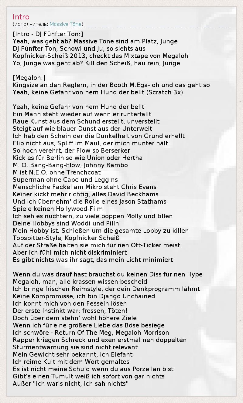 [Intro - DJ Fünfter Ton:] Yeah, was geht ab? Massive Töne sind am Platz, Junge DJ Fünfter Ton, Schowi und Ju, so siehts aus Kopfnicker-Scheiß 2013, checkt das Mixtape von Megaloh Yo, Junge was geht ab? Kill den Scheiß, hau rein, Junge [Megaloh:] Kingsize an den Reglern, in der Booth M.Ega-loh und das geht so Yeah, keine Gefahr von nem Hund der bellt (Scratch 3x) Yeah, keine Gefahr von nem Hund der bellt Ein Mann steht wieder auf wenn er runterfällt Raue Kunst aus dem Schund erstellt, unverstellt Steigt auf wie blauer Dunst aus der Unterwelt Ich hab den Schein der die Dunkelheit von Grund erhellt Flip nicht aus, Spliff im Maul, der mich munter hält So hoch verehrt, der Flow so Berserker Kick es für Berlin so wie Union oder Hertha M. O. Bang-Bang-Flow, Johnny Rambo M ist N.E.O. ohne Trenchcoat Superman ohne Cape und Leggins Menschliche Fackel am Mikro steht Chris Evans Keiner kickt mehr richtig, alles David Beckhams Und ich übernehm' die Rolle eines Jason Stathams Spiele keinen Hollywood-Film Ich seh es nüchtern, zu viele poppen Molly und tillen Deine Hobbys sind Woddi und Pilln' Mein Hobby ist: Schießen um die gesamte Lobby zu killen Topspitter-Style, Kopfnicker Scheiß Auf der Straße halten sie mich für nen Ott-Ticker meist Aber ich fühl mich nicht diskriminiert Es gibt nichts was ihr sagt, das mein Licht minimiert Wenn du was drauf hast brauchst du keinen Diss für nen Hype Megaloh, man, alle krassen wissen bescheid Ich bringe frischen Reimstyle, der dein Denkprogramm lähmt Keine Kompromisse, ich bin Django Unchained Ich konnt mich von den Fesseln lösen Der erste Instinkt war: fressen, Töten! Doch über dem stehn' wohl höhere Ziele Wenn ich für eine größere Liebe das Böse besiege Ich schwöre - Return Of The Meg, Megaloh Morrison Rapper kriegen Schreck und exen erstmal nen doppelten Sturmentwarnung sie sind nicht relevant Mein Gewicht sehr bekannt, ich Elefant Ich reime Kult mit dem Wort gemaltes Es ist nicht meine Schuld wenn du aus Porzellan bist Gibt's einen Tumult weiß ich sofort von gar nichts Außer "ich war's nicht, ich sah nichts"