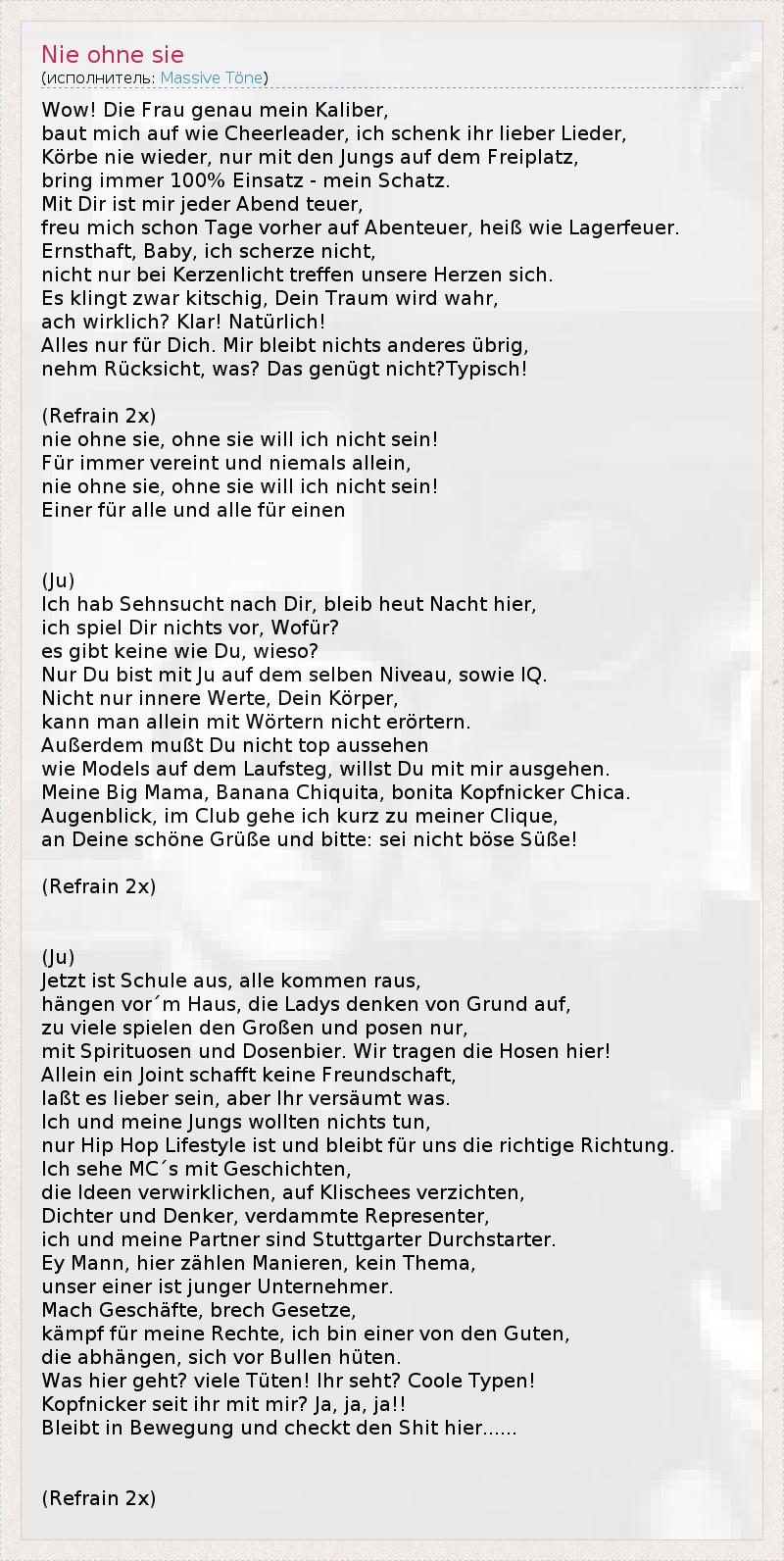 Wow! Die Frau genau mein Kaliber, baut mich auf wie Cheerleader, ich schenk ihr lieber Lieder, Körbe nie wieder, nur mit den Jungs auf dem Freiplatz, bring immer 100% Einsatz - mein Schatz. Mit Dir ist mir jeder Abend teuer, freu mich schon Tage vorher auf Abenteuer, heiß wie Lagerfeuer. Ernsthaft, Baby, ich scherze nicht, nicht nur bei Kerzenlicht treffen unsere Herzen sich. Es klingt zwar kitschig, Dein Traum wird wahr, ach wirklich? Klar! Natürlich! Alles nur für Dich. Mir bleibt nichts anderes übrig, nehm Rücksicht, was? Das genügt nicht?Typisch! (Refrain 2x) nie ohne sie, ohne sie will ich nicht sein! Für immer vereint und niemals allein, nie ohne sie, ohne sie will ich nicht sein! Einer für alle und alle für einen (Ju) Ich hab Sehnsucht nach Dir, bleib heut Nacht hier, ich spiel Dir nichts vor, Wofür? es gibt keine wie Du, wieso? Nur Du bist mit Ju auf dem selben Niveau, sowie IQ. Nicht nur innere Werte, Dein Körper, kann man allein mit Wörtern nicht erörtern. Außerdem mußt Du nicht top aussehen wie Models auf dem Laufsteg, willst Du mit mir ausgehen. Meine Big Mama, Banana Chiquita, bonita Kopfnicker Chica. Augenblick, im Club gehe ich kurz zu meiner Clique, an Deine schöne Grüße und bitte: sei nicht böse Süße! (Refrain 2x) (Ju) Jetzt ist Schule aus, alle kommen raus, hängen vor´m Haus, die Ladys denken von Grund auf, zu viele spielen den Großen und posen nur, mit Spirituosen und Dosenbier. Wir tragen die Hosen hier! Allein ein Joint schafft keine Freundschaft, laßt es lieber sein, aber Ihr versäumt was. Ich und meine Jungs wollten nichts tun, nur Hip Hop Lifestyle ist und bleibt für uns die richtige Richtung. Ich sehe MC´s mit Geschichten, die Ideen verwirklichen, auf Klischees verzichten, Dichter und Denker, verdammte Representer, ich und meine Partner sind Stuttgarter Durchstarter. Ey Mann, hier zählen Manieren, kein Thema, unser einer ist junger Unternehmer. Mach Geschäfte, brech Gesetze, kämpf für meine Rechte, ich bin einer von den Guten, die abhängen, sich vor Bullen hüten. Was hier geht? viele Tüten! Ihr seht? Coole Typen! Kopfnicker seit ihr mit mir? Ja, ja, ja!! Bleibt in Bewegung und checkt den Shit hier...... (Refrain 2x)