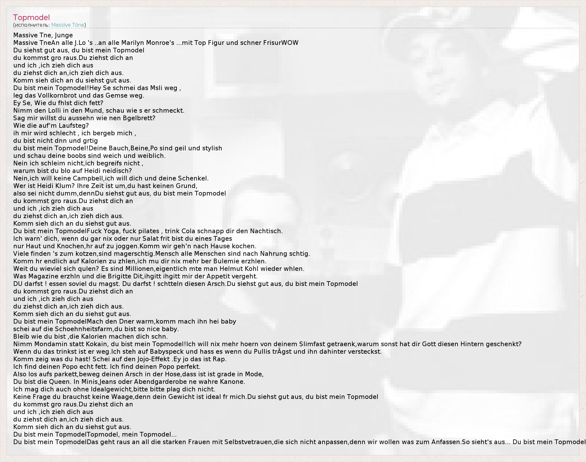Massive Tne, Junge Massive TneAn alle J.Lo 's ..an alle Marilyn Monroe's ...mit Top Figur und schner FrisurWOW Du siehst gut aus, du bist mein Topmodel du kommst gro raus.Du ziehst dich an und ich ,ich zieh dich aus du ziehst dich an,ich zieh dich aus. Komm sieh dich an du siehst gut aus. Du bist mein Topmodel!Hey Se schmei das Msli weg , leg das Vollkornbrot und das Gemse weg. Ey Se, Wie du fhlst dich fett? Nimm den Lolli in den Mund, schau wie s er schmeckt. Sag mir willst du aussehn wie nen Bgelbrett? Wie die auf'm Laufsteg? ih mir wird schlecht , ich bergeb mich , du bist nicht dnn und grtig du bist mein Topmodel!Deine Bauch,Beine,Po sind geil und stylish und schau deine boobs sind weich und weiblich. Nein ich schleim nicht,ich begreifs nicht , warum bist du blo auf Heidi neidisch? Nein,ich will keine Campbell,ich will dich und deine Schenkel. Wer ist Heidi Klum? Ihre Zeit ist um,du hast keinen Grund, also sei nicht dumm,dennDu siehst gut aus, du bist mein Topmodel du kommst gro raus.Du ziehst dich an und ich ,ich zieh dich aus du ziehst dich an,ich zieh dich aus. Komm sieh dich an du siehst gut aus. Du bist mein TopmodelFuck Yoga, fuck pilates , trink Cola schnapp dir den Nachtisch. Ich warn' dich, wenn du gar nix oder nur Salat frit bist du eines Tages nur Haut und Knochen,hr auf zu joggen.Komm wir geh'n nach Hause kochen. Viele finden 's zum kotzen,sind magerschtig.Mensch alle Menschen sind nach Nahrung schtig. Komm hr endlich auf Kalorien zu zhlen,ich mu dir nix mehr ber Bulemie erzhlen. Weit du wieviel sich qulen? Es sind Millionen,eigentlich mte man Helmut Kohl wieder whlen. Was Magazine erzhln und die Brigitte Dit,ihgitt ihgitt mir der Appetit vergeht. DU darfst ! essen soviel du magst. Du darfst ! schtteln diesen Arsch.Du siehst gut aus, du bist mein Topmodel du kommst gro raus.Du ziehst dich an und ich ,ich zieh dich aus du ziehst dich an,ich zieh dich aus. Komm sieh dich an du siehst gut aus. Du bist mein TopmodelMach den Dner warm,komm mach ihn hei baby schei auf die Schoehnheitsfarm,du bist so nice baby. Bleib wie du bist ,die Kalorien machen dich schn. Nimm Mondamin statt Kokain, du bist mein Topmodel!Ich will nix mehr hoern von deinem Slimfast getraenk,warum sonst hat dir Gott diesen Hintern geschenkt? Wenn du das trinkst ist er weg.Ich steh auf Babyspeck und hass es wenn du Pullis trÄgst und ihn dahinter versteckst. Komm zeig was du hast! Schei auf den Jojo-Effekt .Ey jo das ist Rap. Ich find deinen Popo echt fett. Ich find deinen Popo perfekt. Also los aufs parkett,beweg deinen Arsch in der Hose,dass ist ist grade in Mode, Du bist die Queen. In Minis,Jeans oder Abendgarderobe ne wahre Kanone. Ich mag dich auch ohne Idealgewicht,bitte bitte plag dich nicht. Keine Frage du brauchst keine Waage,denn dein Gewicht ist ideal fr mich.Du siehst gut aus, du bist mein Topmodel du kommst gro raus.Du ziehst dich an und ich ,ich zieh dich aus du ziehst dich an,ich zieh dich aus. Komm sieh dich an du siehst gut aus. Du bist mein TopmodelTopmodel, mein Topmodel... Du bist mein TopmodelDas geht raus an all die starken Frauen mit Selbstvetrauen,die sich nicht anpassen,denn wir wollen was zum Anfassen.So sieht's aus... Du bist mein Topmodel