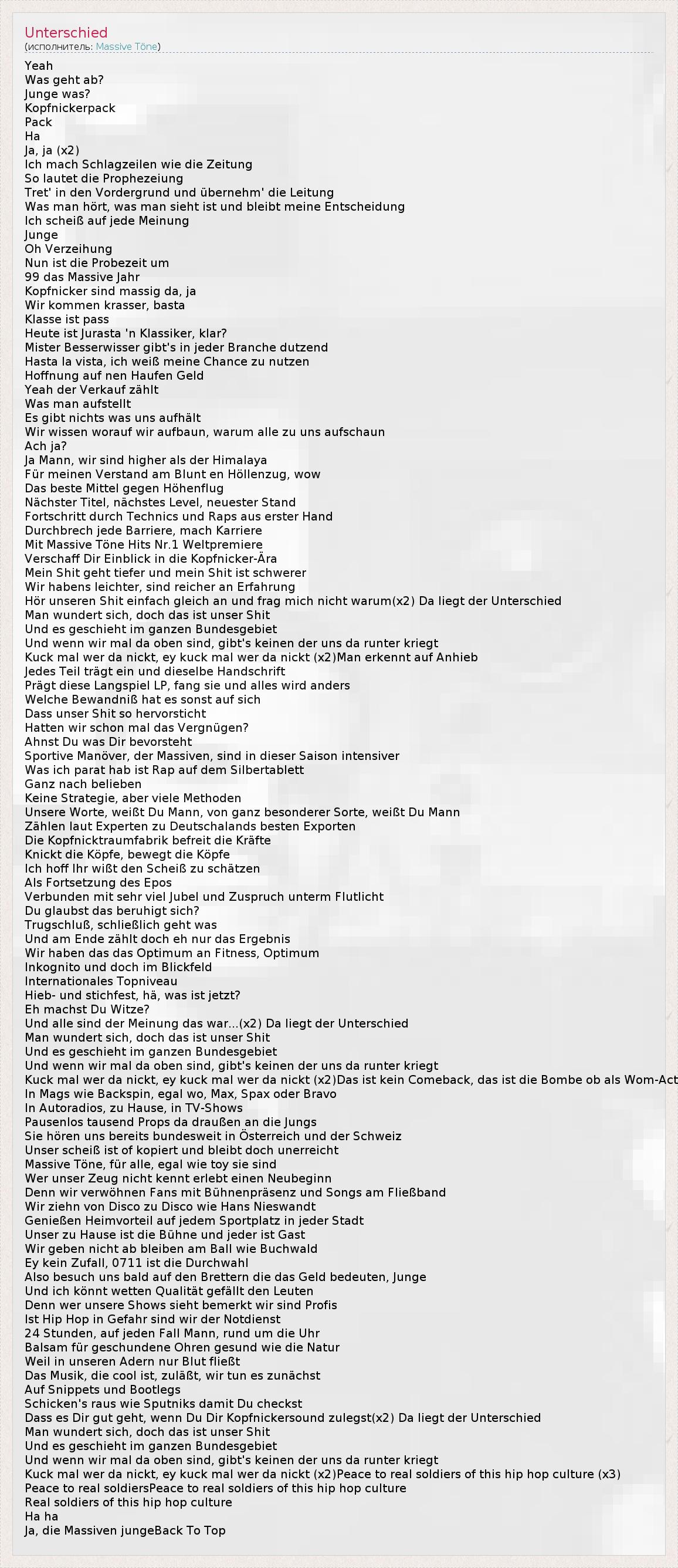 Yeah Was geht ab? Junge was? Kopfnickerpack Pack Ha Ja, ja (x2) Ich mach Schlagzeilen wie die Zeitung So lautet die Prophezeiung Tret' in den Vordergrund und übernehm' die Leitung Was man hört, was man sieht ist und bleibt meine Entscheidung Ich scheiß auf jede Meinung Junge Oh Verzeihung Nun ist die Probezeit um 99 das Massive Jahr Kopfnicker sind massig da, ja Wir kommen krasser, basta Klasse ist pass Heute ist Jurasta 'n Klassiker, klar? Mister Besserwisser gibt's in jeder Branche dutzend Hasta la vista, ich weiß meine Chance zu nutzen Hoffnung auf nen Haufen Geld Yeah der Verkauf zählt Was man aufstellt Es gibt nichts was uns aufhält Wir wissen worauf wir aufbaun, warum alle zu uns aufschaun Ach ja? Ja Mann, wir sind higher als der Himalaya Für meinen Verstand am Blunt en Höllenzug, wow Das beste Mittel gegen Höhenflug Nächster Titel, nächstes Level, neuester Stand Fortschritt durch Technics und Raps aus erster Hand Durchbrech jede Barriere, mach Karriere Mit Massive Töne Hits Nr.1 Weltpremiere Verschaff Dir Einblick in die Kopfnicker-Ära Mein Shit geht tiefer und mein Shit ist schwerer Wir habens leichter, sind reicher an Erfahrung Hör unseren Shit einfach gleich an und frag mich nicht warum(x2) Da liegt der Unterschied Man wundert sich, doch das ist unser Shit Und es geschieht im ganzen Bundesgebiet Und wenn wir mal da oben sind, gibt's keinen der uns da runter kriegt Kuck mal wer da nickt, ey kuck mal wer da nickt (x2)Man erkennt auf Anhieb Jedes Teil trägt ein und dieselbe Handschrift Prägt diese Langspiel LP, fang sie und alles wird anders Welche Bewandniß hat es sonst auf sich Dass unser Shit so hervorsticht Hatten wir schon mal das Vergnügen? Ahnst Du was Dir bevorsteht Sportive Manöver, der Massiven, sind in dieser Saison intensiver Was ich parat hab ist Rap auf dem Silbertablett Ganz nach belieben Keine Strategie, aber viele Methoden Unsere Worte, weißt Du Mann, von ganz besonderer Sorte, weißt Du Mann Zählen laut Experten zu Deutschalands besten Exporten Die Kopfnicktraumfabrik befreit die Kräfte Knickt die Köpfe, bewegt die Köpfe Ich hoff Ihr wißt den Scheiß zu schätzen Als Fortsetzung des Epos Verbunden mit sehr viel Jubel und Zuspruch unterm Flutlicht Du glaubst das beruhigt sich? Trugschluß, schließlich geht was Und am Ende zählt doch eh nur das Ergebnis Wir haben das das Optimum an Fitness, Optimum Inkognito und doch im Blickfeld Internationales Topniveau Hieb- und stichfest, hä, was ist jetzt? Eh machst Du Witze? Und alle sind der Meinung das war...(x2) Da liegt der Unterschied Man wundert sich, doch das ist unser Shit Und es geschieht im ganzen Bundesgebiet Und wenn wir mal da oben sind, gibt's keinen der uns da runter kriegt Kuck mal wer da nickt, ey kuck mal wer da nickt (x2)Das ist kein Comeback, das ist die Bombe ob als Wom-Act In Mags wie Backspin, egal wo, Max, Spax oder Bravo In Autoradios, zu Hause, in TV-Shows Pausenlos tausend Props da draußen an die Jungs Sie hören uns bereits bundesweit in Österreich und der Schweiz Unser scheiß ist of kopiert und bleibt doch unerreicht Massive Töne, für alle, egal wie toy sie sind Wer unser Zeug nicht kennt erlebt einen Neubeginn Denn wir verwöhnen Fans mit Bühnenpräsenz und Songs am Fließband Wir ziehn von Disco zu Disco wie Hans Nieswandt Genießen Heimvorteil auf jedem Sportplatz in jeder Stadt Unser zu Hause ist die Bühne und jeder ist Gast Wir geben nicht ab bleiben am Ball wie Buchwald Ey kein Zufall, 0711 ist die Durchwahl Also besuch uns bald auf den Brettern die das Geld bedeuten, Junge Und ich könnt wetten Qualität gefällt den Leuten Denn wer unsere Shows sieht bemerkt wir sind Profis Ist Hip Hop in Gefahr sind wir der Notdienst 24 Stunden, auf jeden Fall Mann, rund um die Uhr Balsam für geschundene Ohren gesund wie die Natur Weil in unseren Adern nur Blut fließt Das Musik, die cool ist, zuläßt, wir tun es zunächst Auf Snippets und Bootlegs Schicken's raus wie Sputniks damit Du checkst Dass es Dir gut geht, wenn Du Dir Kopfnickersound zulegst(x2) Da liegt der Unterschied Man wundert sich, doch das ist unser Shit Und es geschieht im ganzen Bundesgebiet Und wenn wir mal da oben sind, gibt's keinen der uns da runter kriegt Kuck mal wer da nickt, ey kuck mal wer da nickt (x2)Peace to real soldiers of this hip hop culture (x3) Peace to real soldiersPeace to real soldiers of this hip hop culture Real soldiers of this hip hop culture Ha ha Ja, die Massiven jungeBack To Top