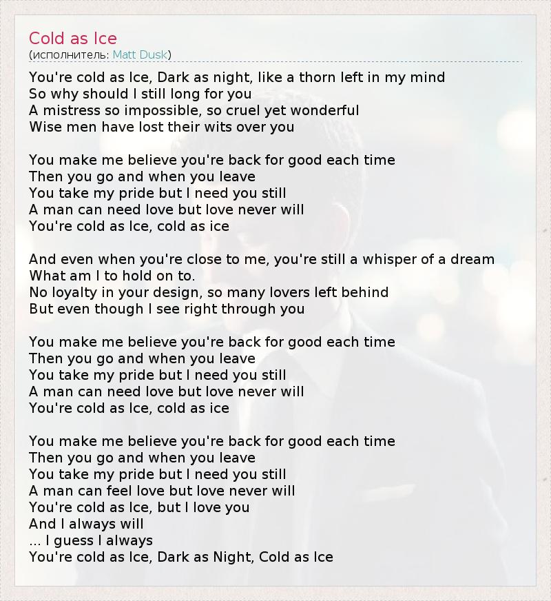 You're cold as Ice, Dark as night, like a thorn left in my mind So why should I still long for you A mistress so impossible, so cruel yet wonderful Wise men have lost their wits over you You make me believe you're back for good each time Then you go and when you leave You take my pride but I need you still A man can need love but love never will You're cold as Ice, cold as ice And even when you're close to me, you're still a whisper of a dream What am I to hold on to. No loyalty in your design, so many lovers left behind But even though I see right through you You make me believe you're back for good each time Then you go and when you leave You take my pride but I need you still A man can need love but love never will You're cold as Ice, cold as ice You make me believe you're back for good each time Then you go and when you leave You take my pride but I need you still A man can feel love but love never will You're cold as Ice, but I love you And I always will ... I guess I always You're cold as Ice, Dark as Night, Cold as Ice