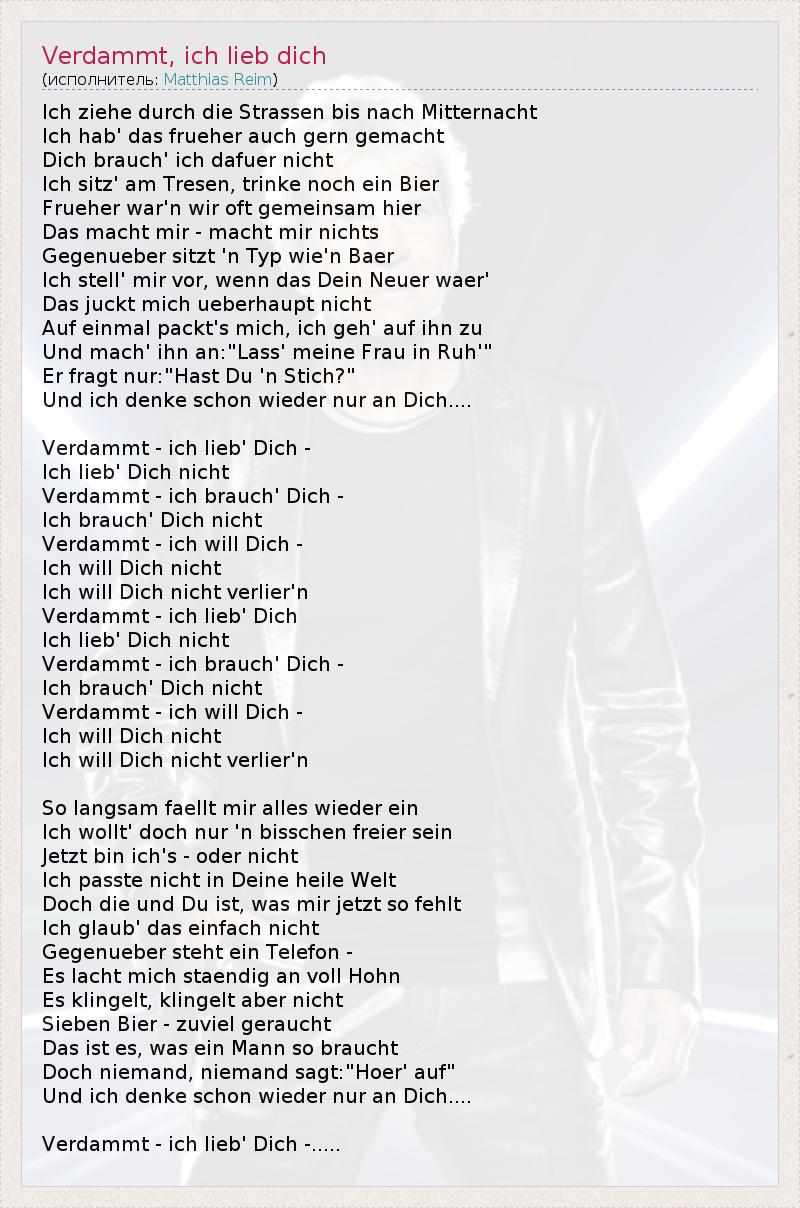Ich ziehe durch die Strassen bis nach Mitternacht Ich hab' das frueher auch gern gemacht Dich brauch' ich dafuer nicht Ich sitz' am Tresen, trinke noch ein Bier Frueher war'n wir oft gemeinsam hier Das macht mir - macht mir nichts Gegenueber sitzt 'n Typ wie'n Baer Ich stell' mir vor, wenn das Dein Neuer waer' Das juckt mich ueberhaupt nicht Auf einmal packt's mich, ich geh' auf ihn zu Und mach' ihn an:"Lass' meine Frau in Ruh'" Er fragt nur:"Hast Du 'n Stich?" Und ich denke schon wieder nur an Dich.... Verdammt - ich lieb' Dich - Ich lieb' Dich nicht Verdammt - ich brauch' Dich - Ich brauch' Dich nicht Verdammt - ich will Dich - Ich will Dich nicht Ich will Dich nicht verlier'n Verdammt - ich lieb' Dich Ich lieb' Dich nicht Verdammt - ich brauch' Dich - Ich brauch' Dich nicht Verdammt - ich will Dich - Ich will Dich nicht Ich will Dich nicht verlier'n So langsam faellt mir alles wieder ein Ich wollt' doch nur 'n bisschen freier sein Jetzt bin ich's - oder nicht Ich passte nicht in Deine heile Welt Doch die und Du ist, was mir jetzt so fehlt Ich glaub' das einfach nicht Gegenueber steht ein Telefon - Es lacht mich staendig an voll Hohn Es klingelt, klingelt aber nicht Sieben Bier - zuviel geraucht Das ist es, was ein Mann so braucht Doch niemand, niemand sagt:"Hoer' auf" Und ich denke schon wieder nur an Dich.... Verdammt - ich lieb' Dich -.....