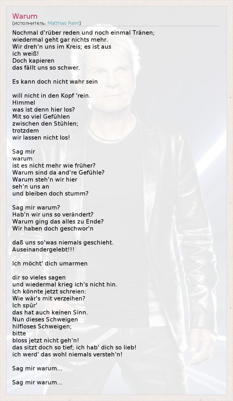 Nochmal d'rüber reden und noch einmal Tränen; wiedermal geht gar nichts mehr. Wir dreh'n uns im Kreis; es ist aus ich weiß! Doch kapieren das fällt uns so schwer. Es kann doch nicht wahr sein will nicht in den Kopf 'rein. Himmel was ist denn hier los? Mit so viel Gefühlen zwischen den Stühlen; trotzdem wir lassen nicht los! Sag mir warum ist es nicht mehr wie früher? Warum sind da and're Gefühle? Warum steh'n wir hier seh'n uns an und bleiben doch stumm? Sag mir warum? Hab'n wir uns so verändert? Warum ging das alles zu Ende? Wir haben doch geschwor'n daß uns so'was niemals geschieht. Auseinandergelebt!!! Ich möcht' dich umarmen dir so vieles sagen und wiedermal krieg ich's nicht hin. Ich könnte jetzt schreien: Wie wär's mit verzeihen? Ich spür' das hat auch keinen Sinn. Nun dieses Schweigen hilfloses Schweigen; bitte bloss jetzt nicht geh'n! das sitzt doch so tief; ich hab' dich so lieb! ich werd' das wohl niemals versteh'n! Sag mir warum... Sag mir warum...