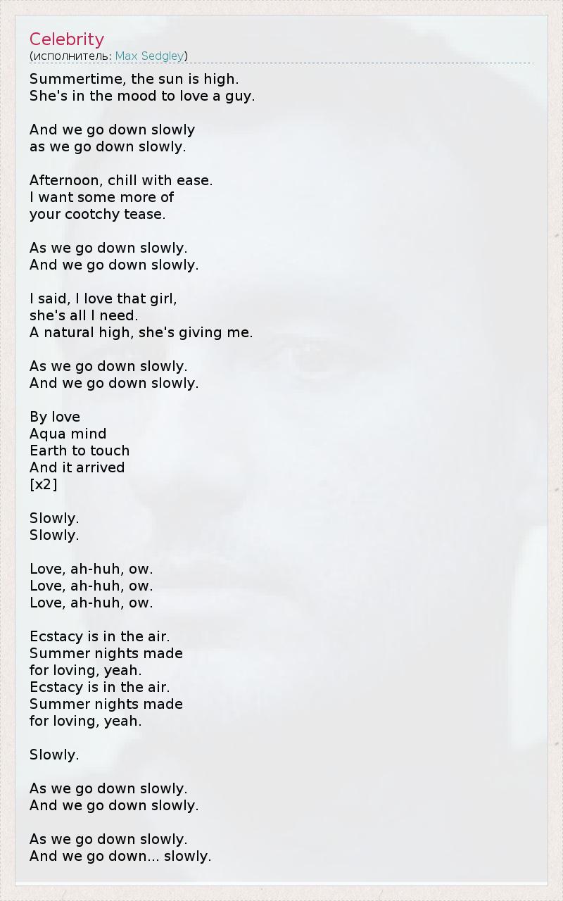 Летнее , солнце стоит высоко . Она в настроении любить парня . И мы идем медленно как мы идем медленно . Во второй половине дня , озноб с легкостью. Я хочу еще немного Ваш cootchy дразнить . Как мы идем медленно . И мы идем медленно . Я сказал , я люблю эту девушку , она все, что нужно . Естественный высокий, она дает мне . Как мы идем медленно . И мы идем медленно . По любви Аква ум Земля на ощупь И он прибыл [x2] Медленно . Медленно . Любовь , ах - ха , вл. Любовь , ах - ха , вл. Любовь , ах - ха , вл. Экстази находится в воздухе . Летние ночи , сделанные Для любящих , да. Экстази находится в воздухе . Летние ночи , сделанные Для любящих , да. Медленно . Как мы идем медленно . И мы идем медленно . Как мы идем медленно . И мы идем вниз ... медленно.