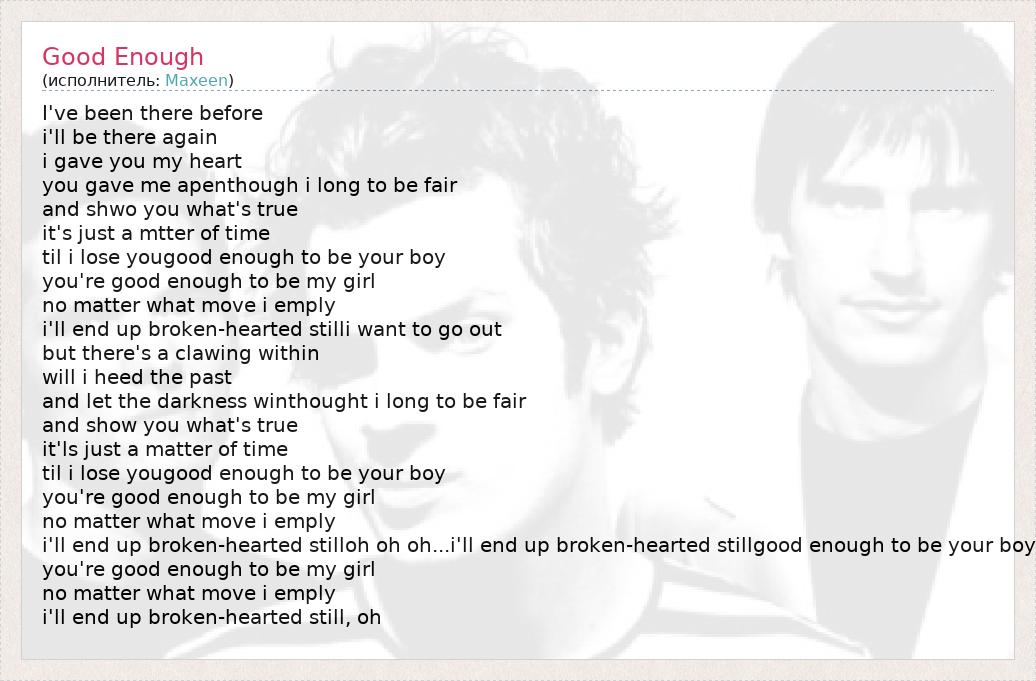 I've been there before i'll be there again i gave you my heart you gave me apenthough i long to be fair and shwo you what's true it's just a mtter of time til i lose yougood enough to be your boy you're good enough to be my girl no matter what move i emply i'll end up broken-hearted stilli want to go out but there's a clawing within will i heed the past and let the darkness winthought i long to be fair and show you what's true it'ls just a matter of time til i lose yougood enough to be your boy you're good enough to be my girl no matter what move i emply i'll end up broken-hearted stilloh oh oh...i'll end up broken-hearted stillgood enough to be your boy you're good enough to be my girl no matter what move i emply i'll end up broken-hearted still, oh