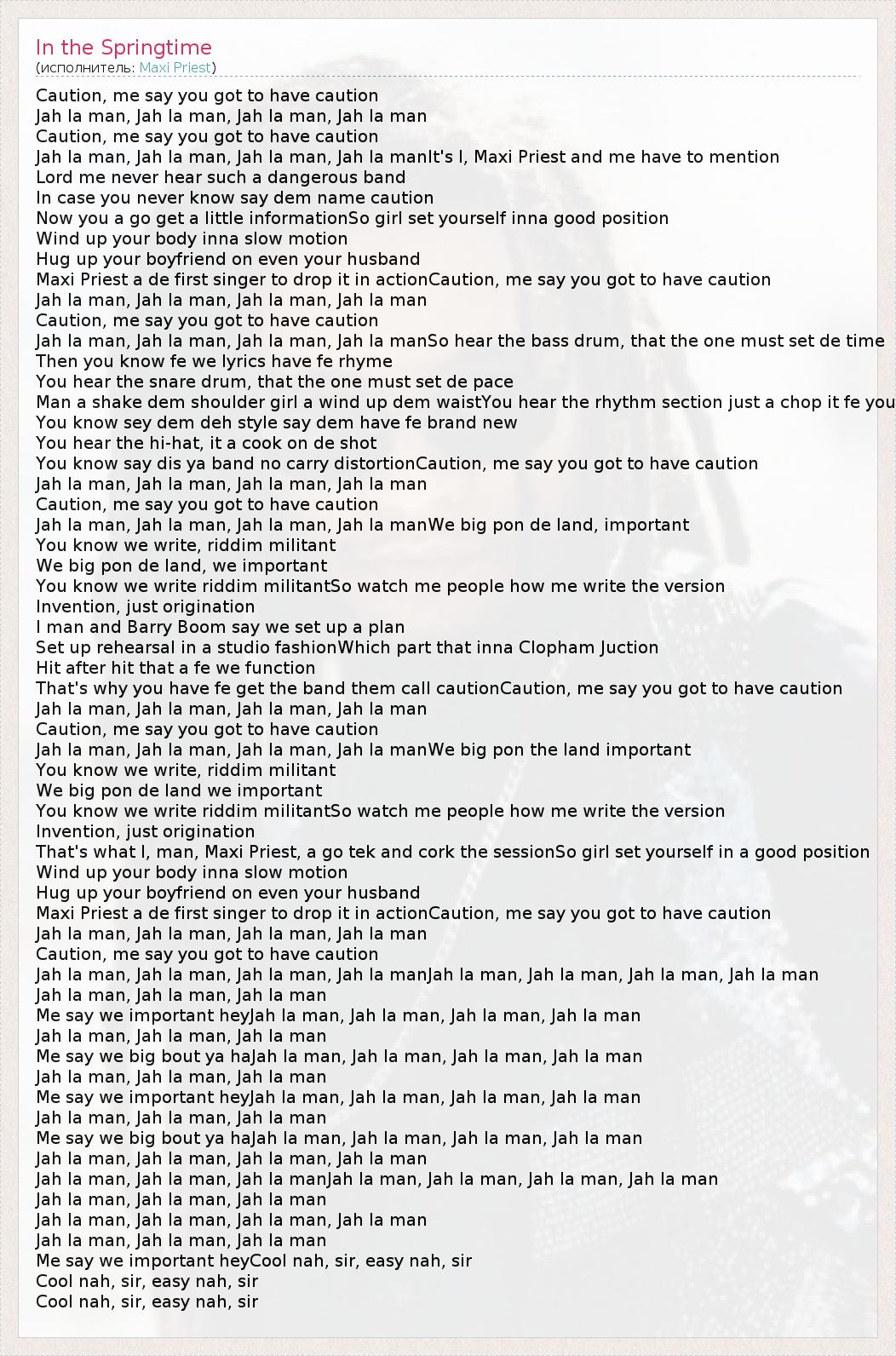 Caution, me say you got to have caution Jah la man, Jah la man, Jah la man, Jah la man Caution, me say you got to have caution Jah la man, Jah la man, Jah la man, Jah la manIt's I, Maxi Priest and me have to mention Lord me never hear such a dangerous band In case you never know say dem name caution Now you a go get a little informationSo girl set yourself inna good position Wind up your body inna slow motion Hug up your boyfriend on even your husband Maxi Priest a de first singer to drop it in actionCaution, me say you got to have caution Jah la man, Jah la man, Jah la man, Jah la man Caution, me say you got to have caution Jah la man, Jah la man, Jah la man, Jah la manSo hear the bass drum, that the one must set de time Then you know fe we lyrics have fe rhyme You hear the snare drum, that the one must set de pace Man a shake dem shoulder girl a wind up dem waistYou hear the rhythm section just a chop it fe you You know sey dem deh style say dem have fe brand new You hear the hi-hat, it a cook on de shot You know say dis ya band no carry distortionCaution, me say you got to have caution Jah la man, Jah la man, Jah la man, Jah la man Caution, me say you got to have caution Jah la man, Jah la man, Jah la man, Jah la manWe big pon de land, important You know we write, riddim militant We big pon de land, we important You know we write riddim militantSo watch me people how me write the version Invention, just origination I man and Barry Boom say we set up a plan Set up rehearsal in a studio fashionWhich part that inna Clopham Juction Hit after hit that a fe we function That's why you have fe get the band them call cautionCaution, me say you got to have caution Jah la man, Jah la man, Jah la man, Jah la man Caution, me say you got to have caution Jah la man, Jah la man, Jah la man, Jah la manWe big pon the land important You know we write, riddim militant We big pon de land we important You know we write riddim militantSo watch me people how me write the version Invention, just origination That's what I, man, Maxi Priest, a go tek and cork the sessionSo girl set yourself in a good position Wind up your body inna slow motion Hug up your boyfriend on even your husband Maxi Priest a de first singer to drop it in actionCaution, me say you got to have caution Jah la man, Jah la man, Jah la man, Jah la man Caution, me say you got to have caution Jah la man, Jah la man, Jah la man, Jah la manJah la man, Jah la man, Jah la man, Jah la man Jah la man, Jah la man, Jah la man Me say we important heyJah la man, Jah la man, Jah la man, Jah la man Jah la man, Jah la man, Jah la man Me say we big bout ya haJah la man, Jah la man, Jah la man, Jah la man Jah la man, Jah la man, Jah la man Me say we important heyJah la man, Jah la man, Jah la man, Jah la man Jah la man, Jah la man, Jah la man Me say we big bout ya haJah la man, Jah la man, Jah la man, Jah la man Jah la man, Jah la man, Jah la man, Jah la man Jah la man, Jah la man, Jah la manJah la man, Jah la man, Jah la man, Jah la man Jah la man, Jah la man, Jah la man Jah la man, Jah la man, Jah la man, Jah la man Jah la man, Jah la man, Jah la man Me say we important heyCool nah, sir, easy nah, sir Cool nah, sir, easy nah, sir Cool nah, sir, easy nah, sir