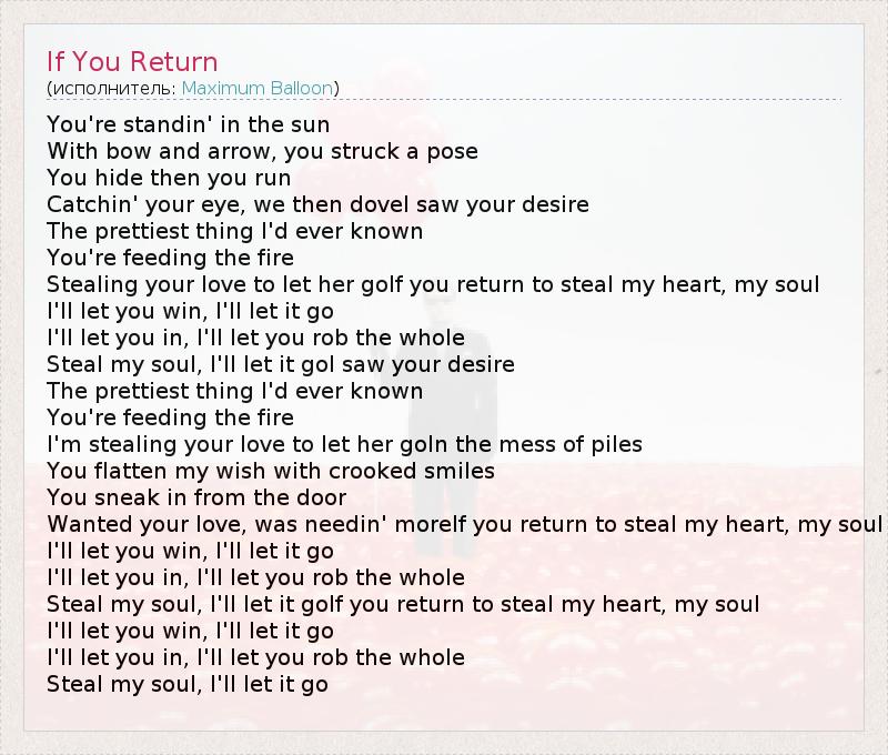 You're standin' in the sun With bow and arrow, you struck a pose You hide then you run Catchin' your eye, we then doveI saw your desire The prettiest thing I'd ever known You're feeding the fire Stealing your love to let her goIf you return to steal my heart, my soul I'll let you win, I'll let it go I'll let you in, I'll let you rob the whole Steal my soul, I'll let it goI saw your desire The prettiest thing I'd ever known You're feeding the fire I'm stealing your love to let her goIn the mess of piles You flatten my wish with crooked smiles You sneak in from the door Wanted your love, was needin' moreIf you return to steal my heart, my soul I'll let you win, I'll let it go I'll let you in, I'll let you rob the whole Steal my soul, I'll let it goIf you return to steal my heart, my soul I'll let you win, I'll let it go I'll let you in, I'll let you rob the whole Steal my soul, I'll let it go