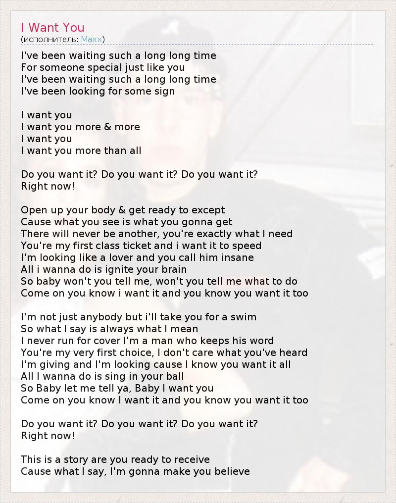 I've been waiting such a long long time For someone special just like you I've been waiting such a long long time I've been looking for some sign I want you I want you more & more I want you I want you more than all Do you want it? Do you want it? Do you want it? Right now! Open up your body & get ready to except Cause what you see is what you gonna get There will never be another, you're exactly what I need You're my first class ticket and i want it to speed I'm looking like a lover and you call him insane All i wanna do is ignite your brain So baby won't you tell me, won't you tell me what to do Come on you know i want it and you know you want it too I'm not just anybody but i'll take you for a swim So what I say is always what I mean I never run for cover I'm a man who keeps his word You're my very first choice, I don't care what you've heard I'm giving and I'm looking cause I know you want it all All I wanna do is sing in your ball So Baby let me tell ya, Baby I want you Come on you know I want it and you know you want it too Do you want it? Do you want it? Do you want it? Right now! This is a story are you ready to receive Cause what I say, I'm gonna make you believe