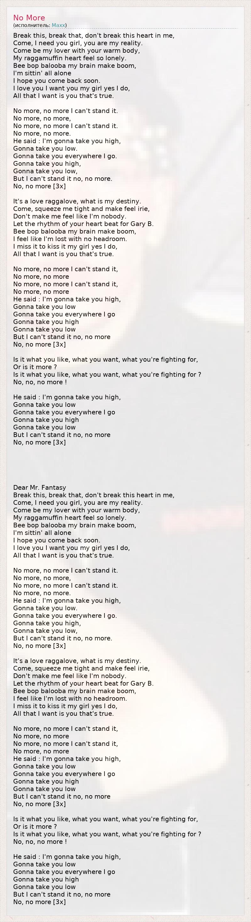 Break this, break that, don't break this heart in me, Come, I need you girl, you are my reality. Come be my lover with your warm body, My raggamuffin heart feel so lonely. Bee bop balooba my brain make boom, I'm sittin' all alone I hope you come back soon. I love you I want you my girl yes I do, All that I want is you that's true. No more, no more I can't stand it. No more, no more, No more, no more I can't stand it. No more, no more. He said : I'm gonna take you high, Gonna take you low. Gonna take you everywhere I go. Gonna take you high, Gonna take you low, But I can't stand it no, no more. No, no more [3x] It's a love raggalove, what is my destiny. Come, squeeze me tight and make feel irie, Don't make me feel like I'm nobody. Let the rhythm of your heart beat for Gary B. Bee bop balooba my brain make boom, I feel like I'm lost with no headroom. I miss it to kiss it my girl yes I do, All that I want is you that's true. No more, no more I can't stand it, No more, no more No more, no more I can't stand it, No more, no more He said : I'm gonna take you high, Gonna take you low Gonna take you everywhere I go Gonna take you high Gonna take you low But I can't stand it no, no more No, no more [3x] Is it what you like, what you want, what you're fighting for, Or is it more ? Is it what you like, what you want, what you're fighting for ? No, no, no more ! He said : I'm gonna take you high, Gonna take you low Gonna take you everywhere I go Gonna take you high Gonna take you low But I can't stand it no, no more No, no more [3x] Dear Mr. Fantasy Break this, break that, don't break this heart in me, Come, I need you girl, you are my reality. Come be my lover with your warm body, My raggamuffin heart feel so lonely. Bee bop balooba my brain make boom, I'm sittin' all alone I hope you come back soon. I love you I want you my girl yes I do, All that I want is you that's true. No more, no more I can't stand it. No more, no more, No more, no more I can't stand it. No more, no more. He said : I'm gonna take you high, Gonna take you low. Gonna take you everywhere I go. Gonna take you high, Gonna take you low, But I can't stand it no, no more. No, no more [3x] It's a love raggalove, what is my destiny. Come, squeeze me tight and make feel irie, Don't make me feel like I'm nobody. Let the rhythm of your heart beat for Gary B. Bee bop balooba my brain make boom, I feel like I'm lost with no headroom. I miss it to kiss it my girl yes I do, All that I want is you that's true. No more, no more I can't stand it, No more, no more No more, no more I can't stand it, No more, no more He said : I'm gonna take you high, Gonna take you low Gonna take you everywhere I go Gonna take you high Gonna take you low But I can't stand it no, no more No, no more [3x] Is it what you like, what you want, what you're fighting for, Or is it more ? Is it what you like, what you want, what you're fighting for ? No, no, no more ! He said : I'm gonna take you high, Gonna take you low Gonna take you everywhere I go Gonna take you high Gonna take you low But I can't stand it no, no more No, no more [3x]