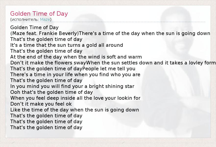 Golden Time of Day (Maze feat. Frankie Beverly)There's a time of the day when the sun is going down That's the golden time of day It's a time that the sun turns a gold all around That's the golden time of day At the end of the day when the wind is soft and warm Don't it make the flowers swayWhen the sun settles down and it takes a lovley form That's the golden time of dayPeople let me tell you There's a time in your life when you find who you are That's the golden time of day In you mind you will find your a bright shining star Ooh that's the golden time of day When you feel deep inside all the love your lookin for Don't it make you feel ok Like the time of the day when the sun is going down That's the golden time of day That's the golden time of day That's the golden time of day