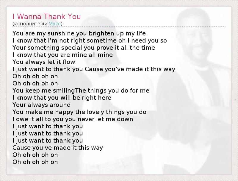 You are my sunshine you brighten up my life I know that I'm not right sometime oh I need you so Your something special you prove it all the time I know that you are mine all mine You always let it flow I just want to thank you Cause you've made it this way Oh oh oh oh oh Oh oh oh oh oh You keep me smilingThe things you do for me I know that you will be right here Your always around You make me happy the lovely things you do I owe it all to you you never let me down I just want to thank you I just want to thank you I just want to thank you Cause you've made it this way Oh oh oh oh oh Oh oh oh oh oh