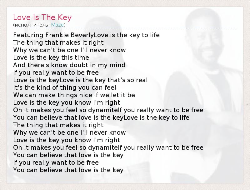 Featuring Frankie BeverlyLove is the key to life The thing that makes it right Why we can't be one I'll never know Love is the key this time And there's know doubt in my mind If you really want to be free Love is the keyLove is the key that's so real It's the kind of thing you can feel We can make things nice If we let it be Love is the key you know I'm right Oh it makes you feel so dynamiteIf you really want to be free You can believe that love is the keyLove is the key to life The thing that makes it right Why we can't be one I'll never know Love is the key you know I'm right Oh it makes you feel so dynamiteIf you really want to be free You can believe that love is the key If you really want to be free You can believe that love is the key