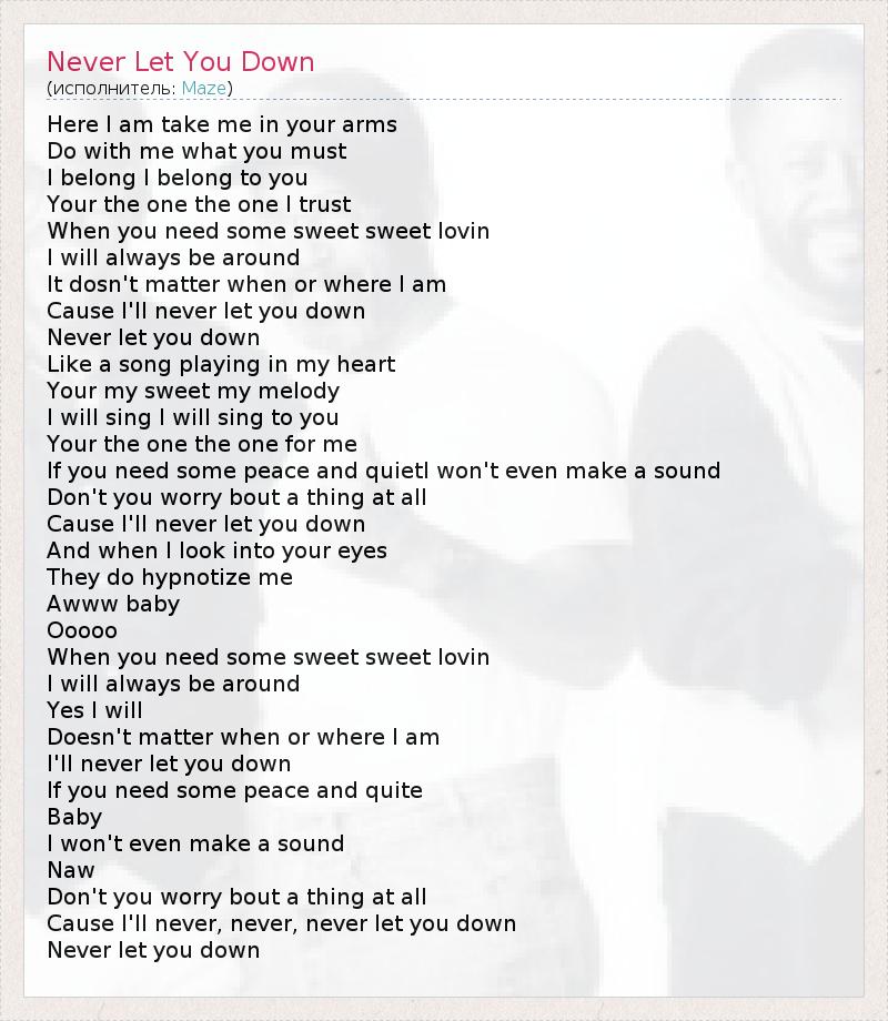 Here I am take me in your arms Do with me what you must I belong I belong to you Your the one the one I trust When you need some sweet sweet lovin I will always be around It dosn't matter when or where I am Cause I'll never let you down Never let you down Like a song playing in my heart Your my sweet my melody I will sing I will sing to you Your the one the one for me If you need some peace and quietI won't even make a sound Don't you worry bout a thing at all Cause I'll never let you down And when I look into your eyes They do hypnotize me Awww baby Ooooo When you need some sweet sweet lovin I will always be around Yes I will Doesn't matter when or where I am I'll never let you down If you need some peace and quite Baby I won't even make a sound Naw Don't you worry bout a thing at all Cause I'll never, never, never let you down Never let you down
