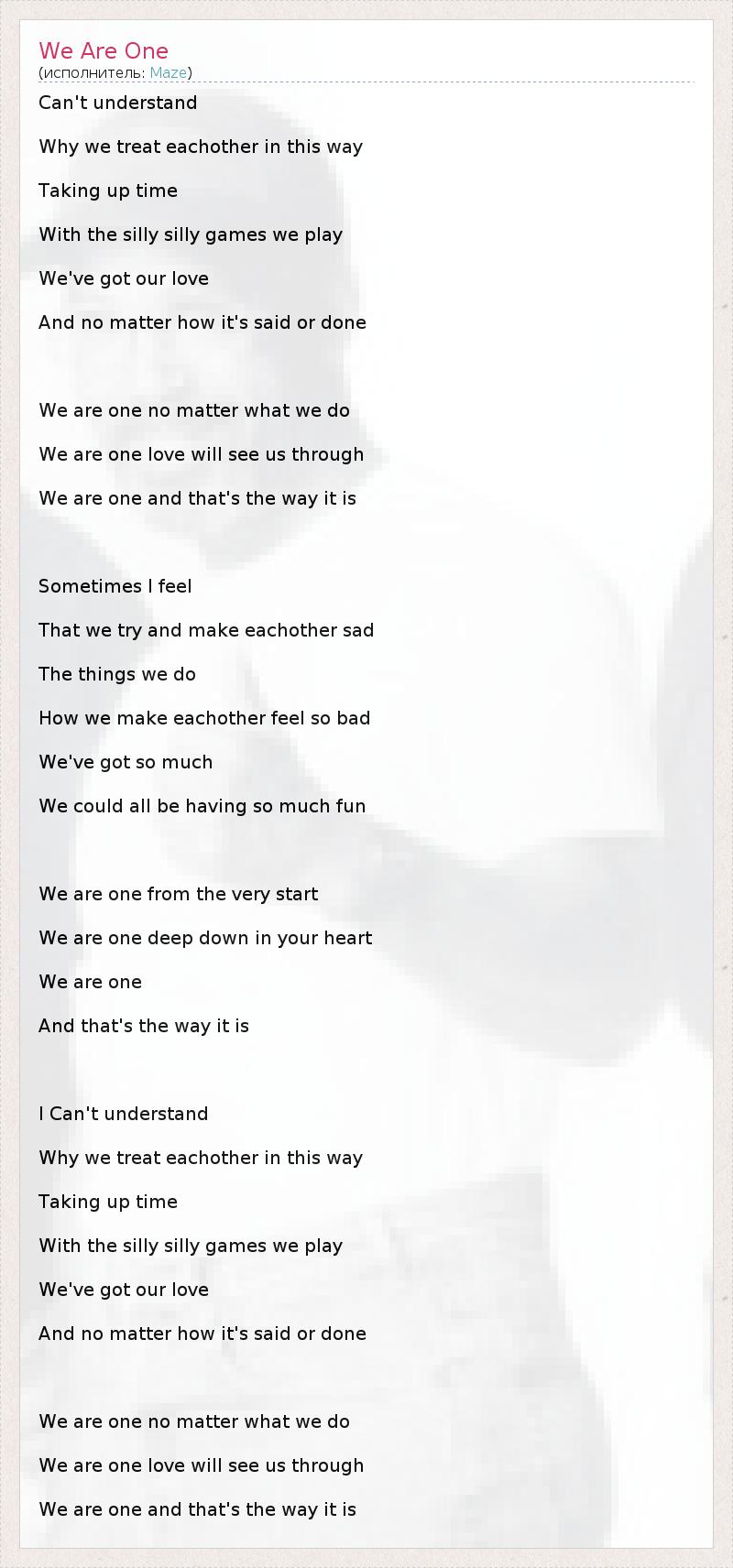 Can't understand Why we treat eachother in this way Taking up time With the silly silly games we play We've got our love And no matter how it's said or done We are one no matter what we do We are one love will see us through We are one and that's the way it is Sometimes I feel That we try and make eachother sad The things we do How we make eachother feel so bad We've got so much We could all be having so much fun We are one from the very start We are one deep down in your heart We are one And that's the way it is I Can't understand Why we treat eachother in this way Taking up time With the silly silly games we play We've got our love And no matter how it's said or done We are one no matter what we do We are one love will see us through We are one and that's the way it is